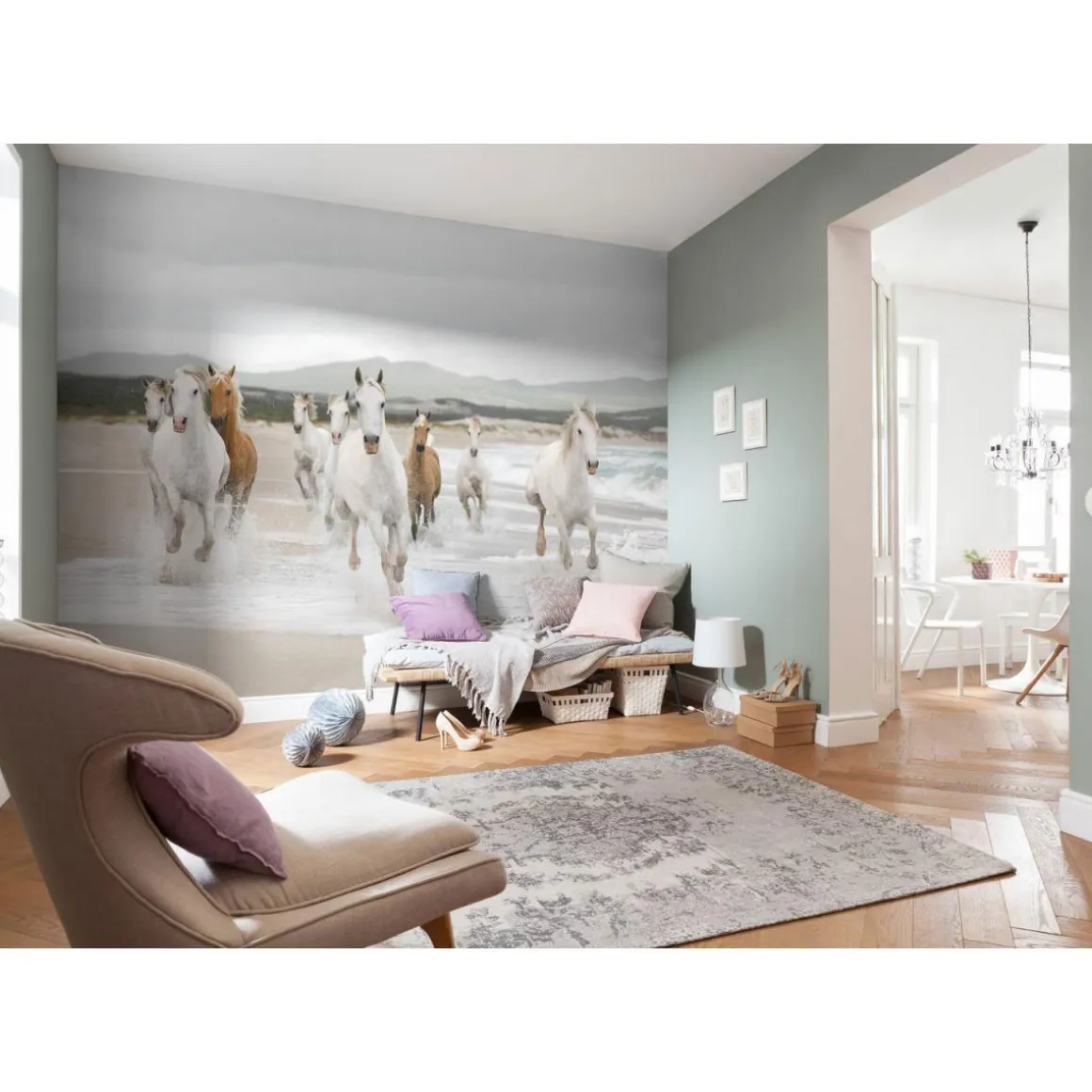 Die Komar Papier-Fototapete White Horses ist ideal für alle Tierliebhaber und Menschen, die ihrem Zuhause eine besondere Note verleihen möchten. Sie eignet sich perfekt für Wohnzimmer oder andere Räume und sorgt für einen Blickfang an der Wand.