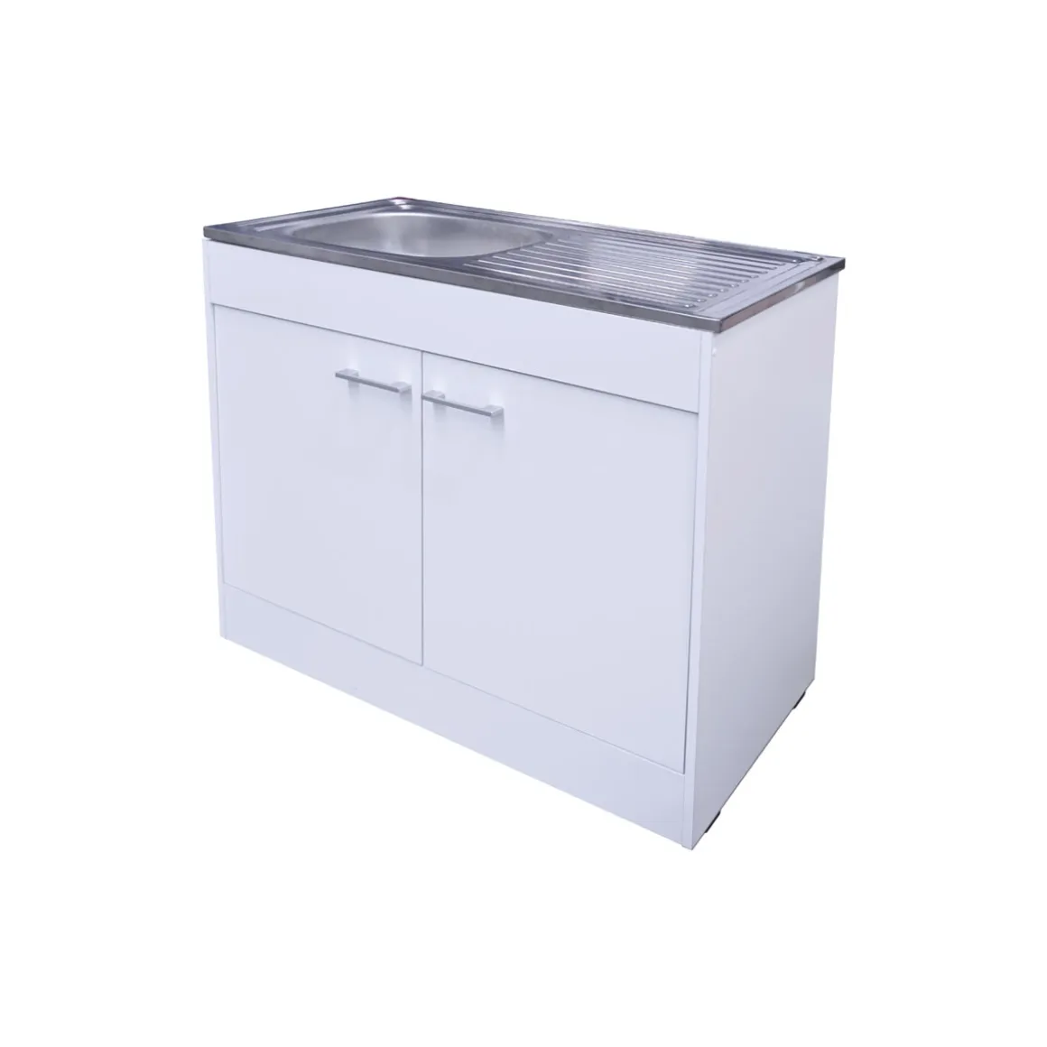 Die Komplettspüle ist vielseitig und universell einsetzbar. Ob in Küche, Hauswirtschaftsraum, im Keller oder in der Garage diese Komplettspüle ist das ideale Anstellmöbel. Der Unterschrank überzeugt durch eine geradlinige Formgebung und pflegeleichte Oberflächen. Dabei bietet Ihnen der hochwertige Spülenunterschrank ein helles freundliches Design in weiß. Die 100 cm breite Komplettspüle verfügt über eine Edelstahl-Auflagespüle inkl. Ablaufgarnitur, in der schnell ein kleiner Abwasch erledigt werden kann.