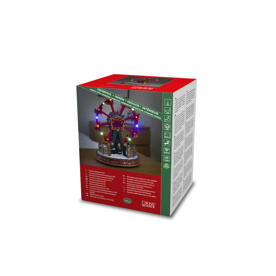 Mit dieser Konstsmide LED-Szenerie bringen Sie Freude und Begeisterung in Ihr Zuhause. Die animierten Gondeln des Riesenrads drehen sich sanft im Kreis und verbreiten eine gemütliche Atmosphäre. Die integrierte Musikfunktion rundet das Gesamterlebnis ab.