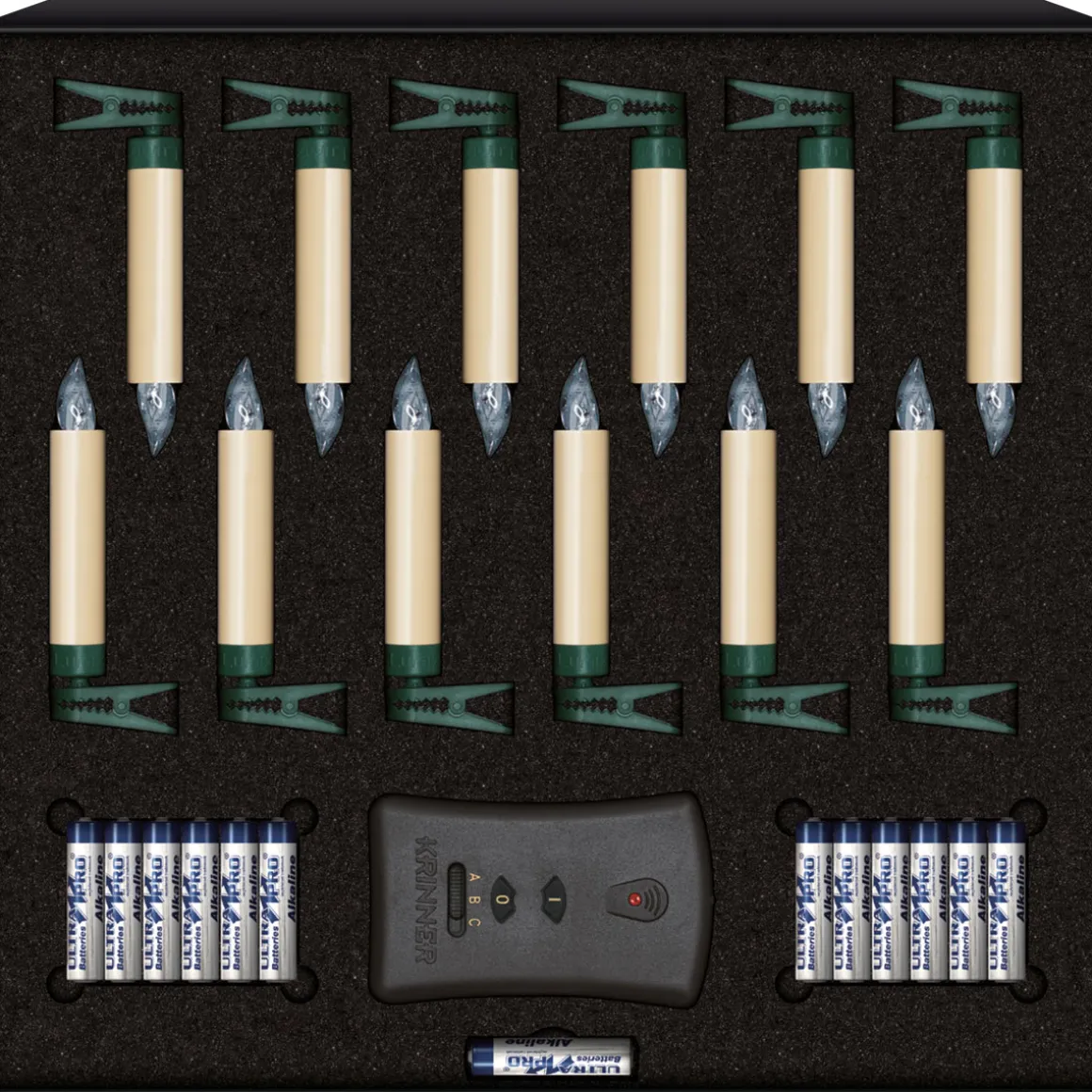 Zur Weihnachtsbaumkerze gehören 12 LED-Leuchten. Die Lichtanordnung wird mit Batterien betrieben. Damit bleiben Sie flexibel im Einsatz und unabhängig von Steckdosen.