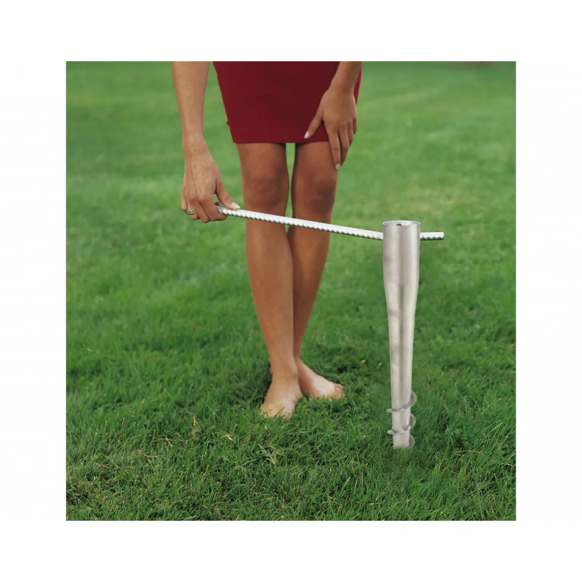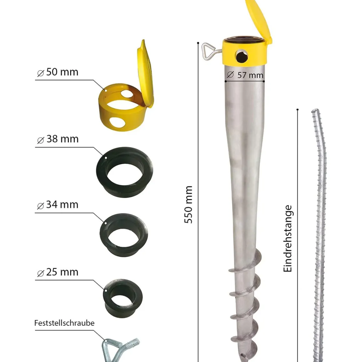 - Lieferumfang: Bodendübel inklusive Eindrehstange, Reduzierhülsen (50 mm, 38 mm, 34 mm und 25 mm)
