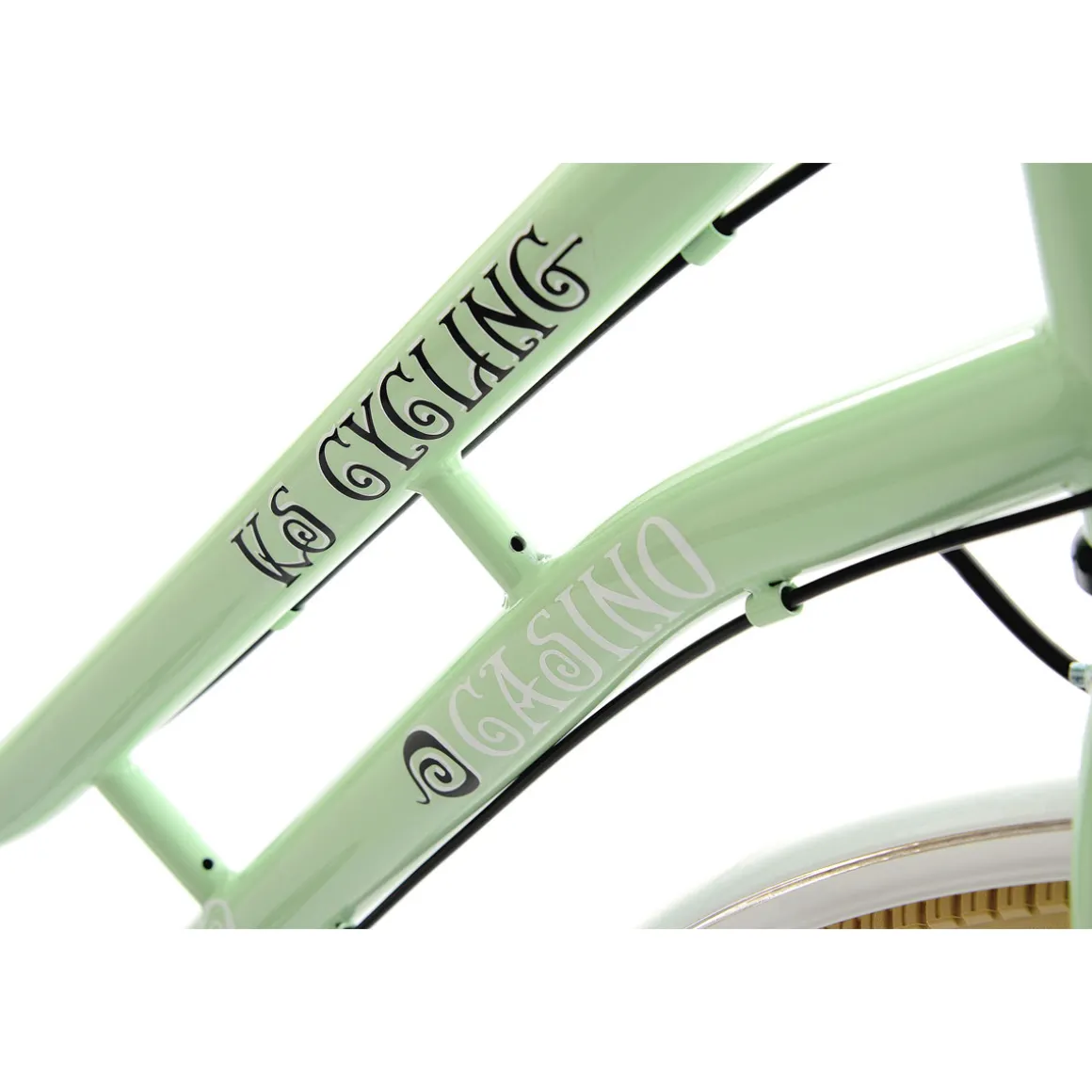 Der pastellfarbene Rahmen trifft den Farbton der Saison. Die passenden Griffe, Sattel und Reifen in Cremefarbe verleihen dem CASINO Damenfahrrad den einzigartigen Retro-Look. Wer denkt beim diesem Anblick nicht unweigerlich an Cuba Libre, das besondere Temperament und die traditionellen Tänze der Kubaner oder summt in Gedanken „Guantanamera …“?