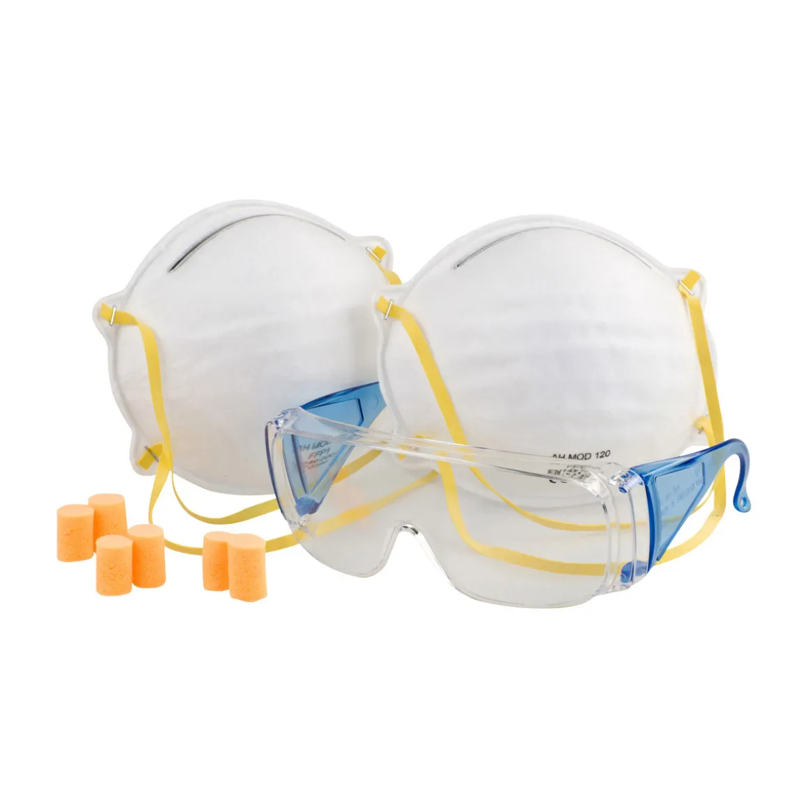- Das Set ist 6-teilig und enthält 3x Einweg-Gehörschutzstöpsel, 1x Schutzbrille und 2 staubmasken FFP1.