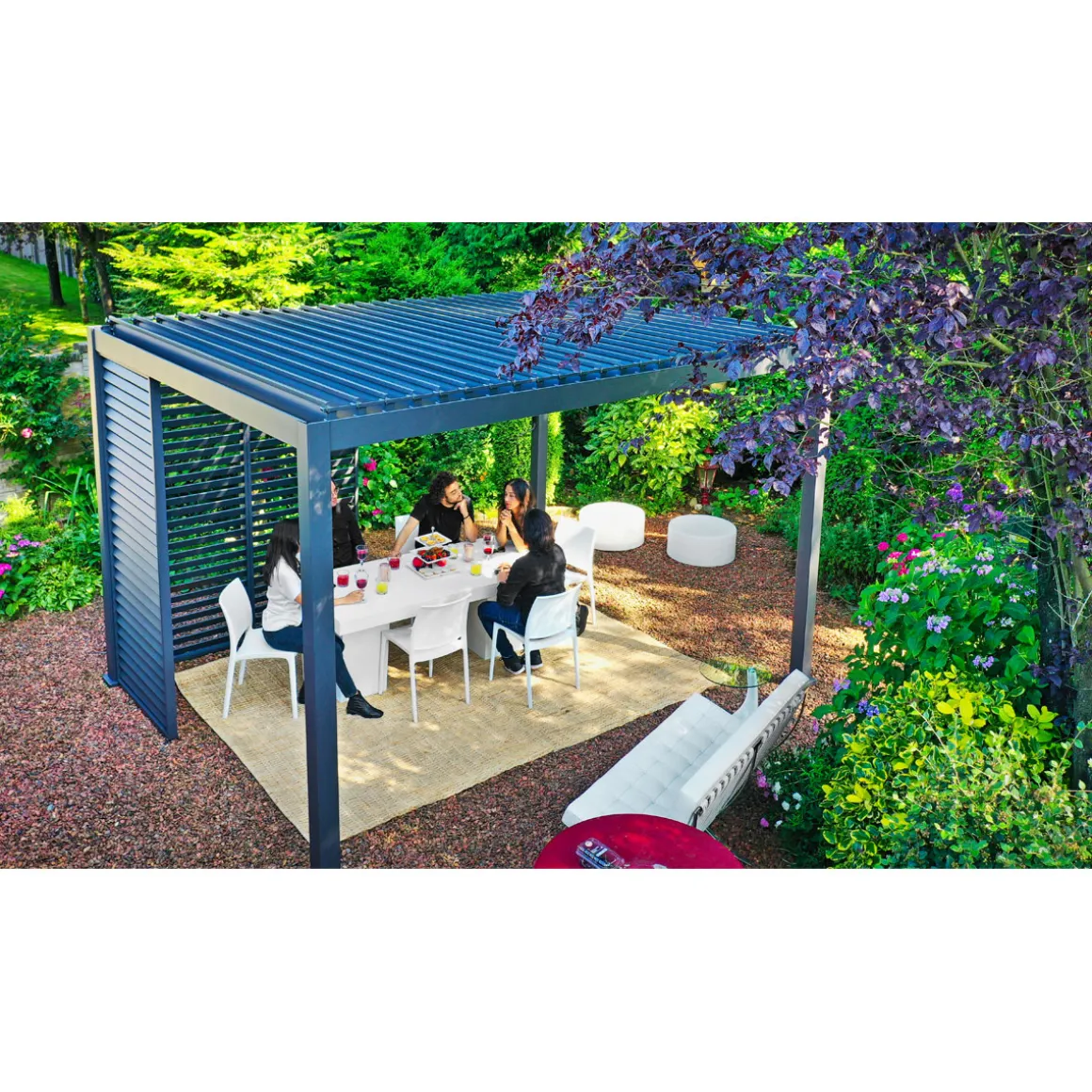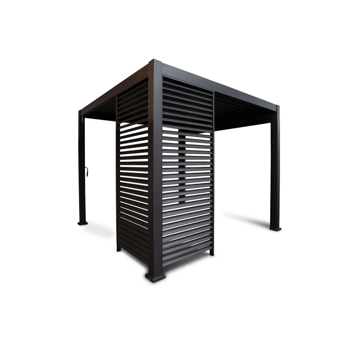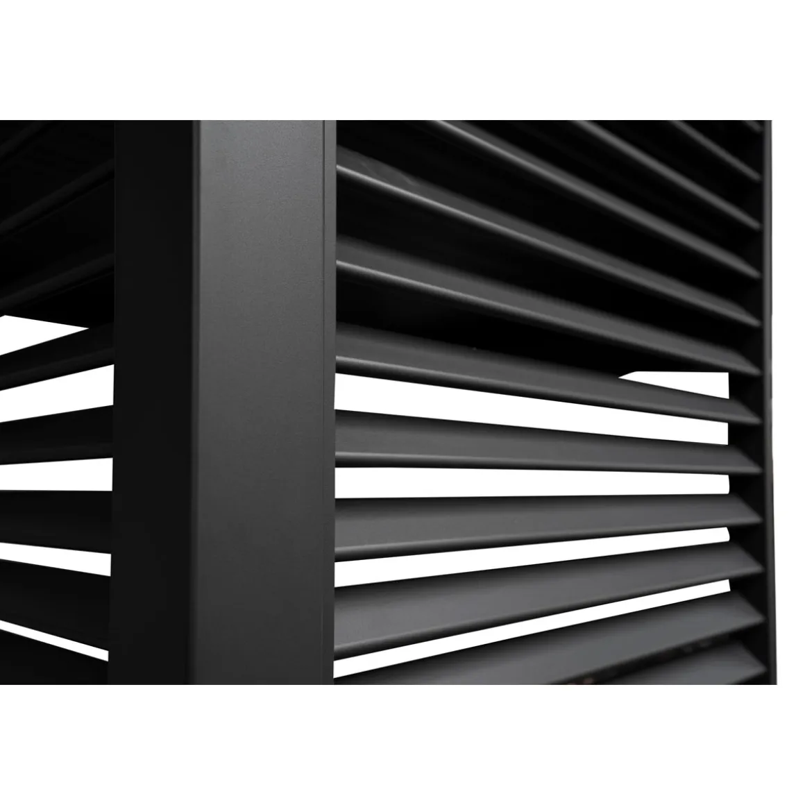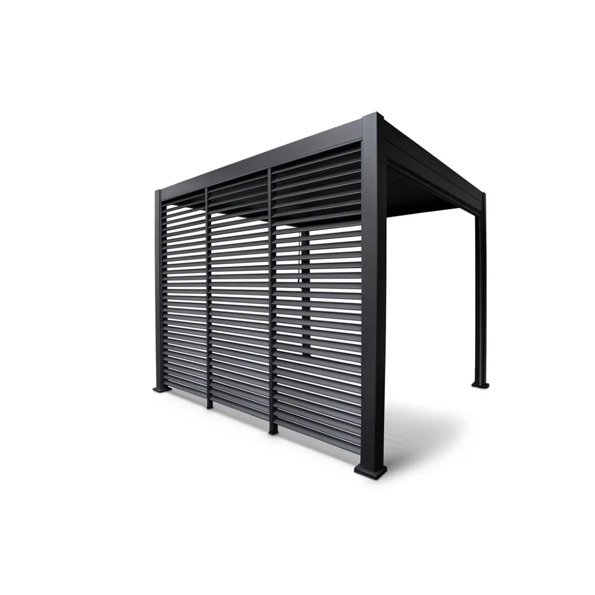 Die Lamellenwand ist einzeln erhältlich und kann modular eingesetzt werden. Eine ganze Seite kann mit drei Wänden ausgefüllt werden. Ebenso ist es möglich, die Lamellenwand z. B. in einer Ecke anzubringen. Die Lamellenwand ist in drei verschiedenen Größen erhältlich, sodass es für jede Größe der Pergola „111 Deluxe“ eine passende Lösung gibt.