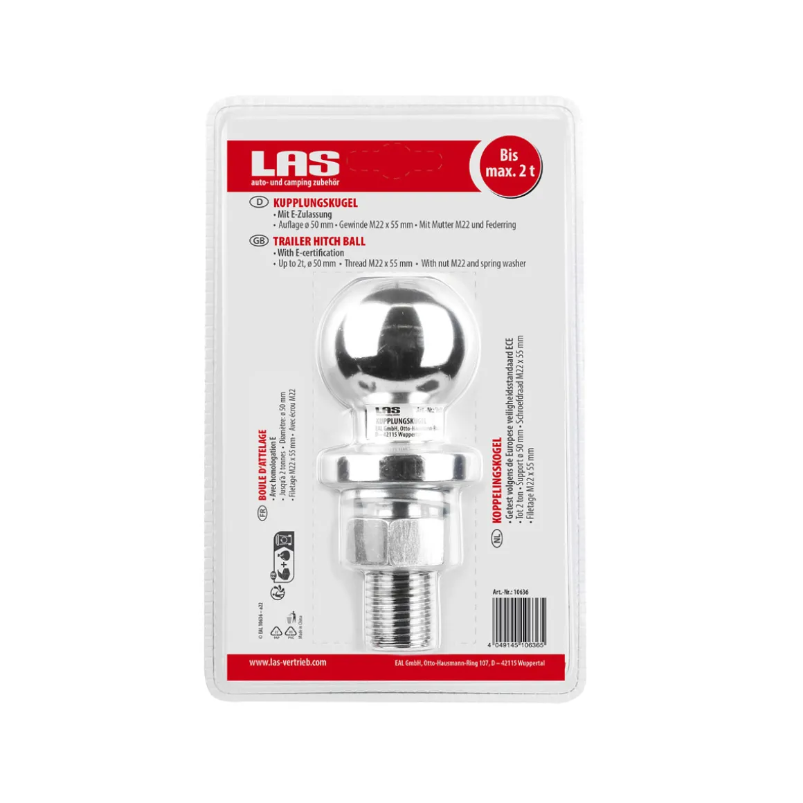 „Warum warten? Die LAS-Kupplungskugel bis zu zwei Tonnen Zugkraft wartet darauf, Ihre Transporte sicherer zu machen! Vertrauen Sie auf geprüfte Qualität mit E-Zulassung sowie kinderleichte Handhabung dank des praktischen Gewindesystems M22 samt Zubehörteilen wie Mutter & Federring.“