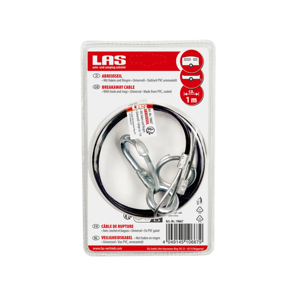 Sichern Sie Ihre Ladung zuverlässig mit dem LAS 10667 Abreißseil. Das robuste Stahlseil ist PVC-ummantelt und hat eine Länge von einem Meter. Es ist universell einsetzbar und verfügt über praktische Haken und Ringe für eine einfache Befestigung.