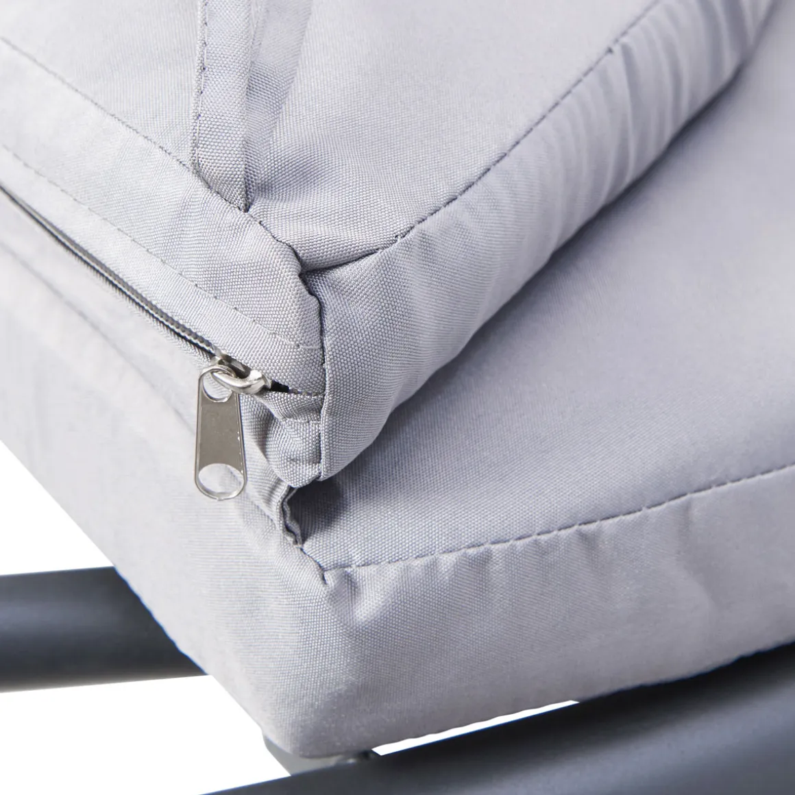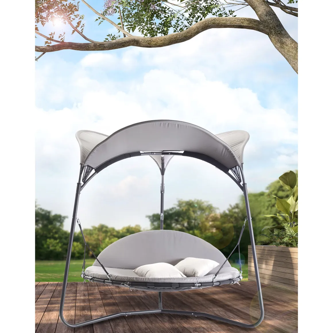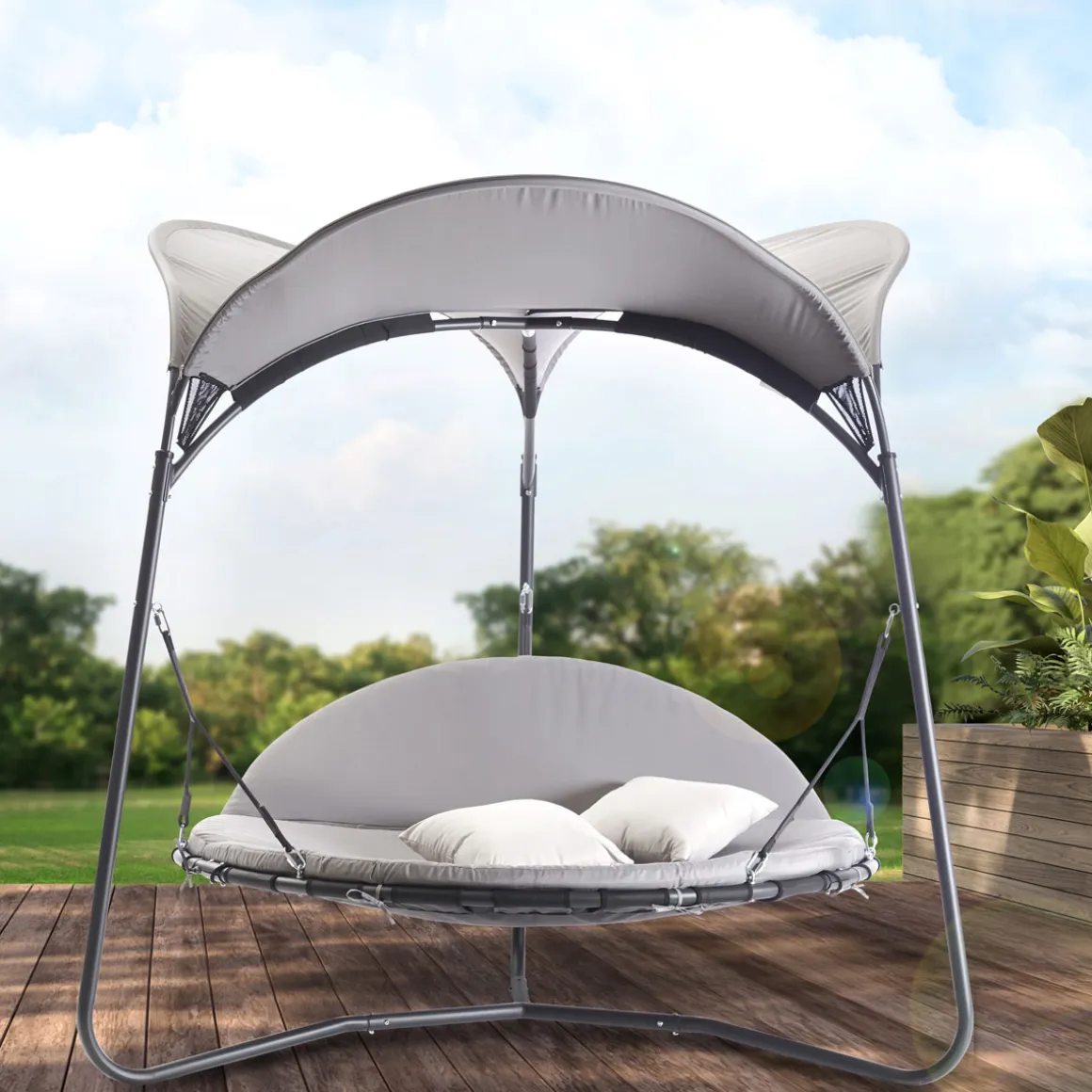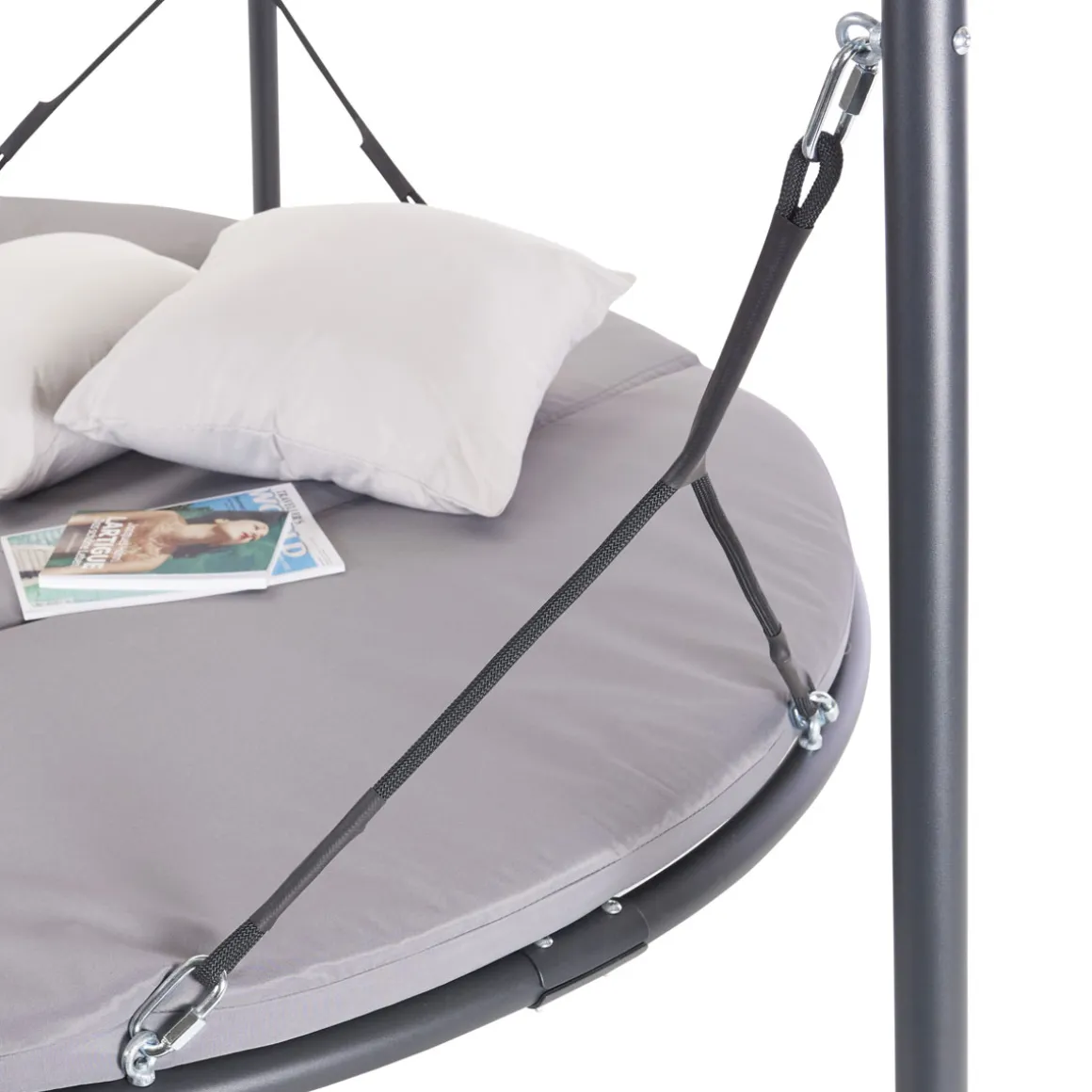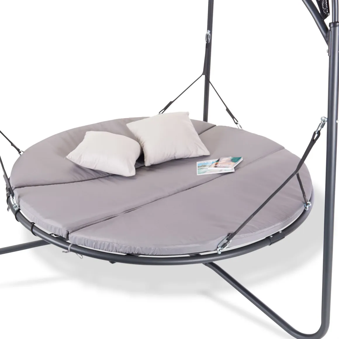 Dieses luxuriöse Schaukelbett ermöglicht den Sommer entspannt zu genießen. Das robuste Gestell ist aus Stahlrohr gefertigt und dank der Pulverbeschichtung besonders witterungsbeständig. Die Textilien aus Polyester sind sehr pflegeleicht. Durch die mitgelieferten Kissen verwandelt sich dieses Schaukelbett zu einer Ruheoase.