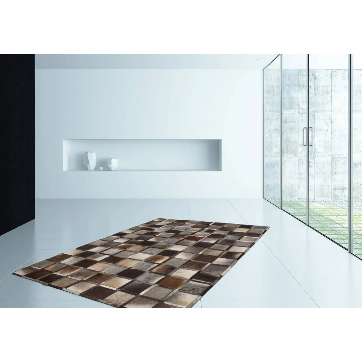 Echter Lederteppich – UnikatDer schöne Lederteppich ist ein Naturteppich, der etwas ganz Besonderes in Ihre vier Wände bringt: ein edles Ambiente mit einmaligem Style. Das Design in Schachbrettoptik aus verschiedenen natürlichen Felltönen ergibt ein harmonisches Gesamtbild. Das handgefertigte Unikat wird aus ausgewähltem Material feinster Qualität hergestellt. Natürliche Unregelmäßigkeiten von bis zu 30 % in Farbe, Struktur und Maß unterstreichen die Originalität und die Einzigartigkeit eines jeden Lederteppichs. Das natürliche Fell kann nach einiger Zeit und bei hoher Beanspruchung gegebenenfalls an Haaren verlieren. Dies ist dem Naturprodukt geschuldet und kein Produktionsfehler.Zeitlos und universell einsetzbar wirkt der Teppich in hohem Maß luxuriös und wird, richtig platziert, zum Eyecatcher – egal ob im Wohnzimmer, Durchgangsbereich oder in einem anderen Raum. Der wundervolle Lederteppich begeistert durch seine hochwertige Verarbeitung und besten Komfort. Er ist ein extravagantes Heimtextil für Menschen mit viel Stil- und Einrichtungsgefühl. Auch bei starker Beanspruchung behält er durch das natürliche Material seine weiche Haptik und ist daher ideal für viel genutzte Räume geeignet. Gleichzeitig ist der widerstandsfähige und robuste Teppich lichtecht und einfach zu reinigen. Das schwere Gewicht des Teppichs spricht für seine gute Qualität.