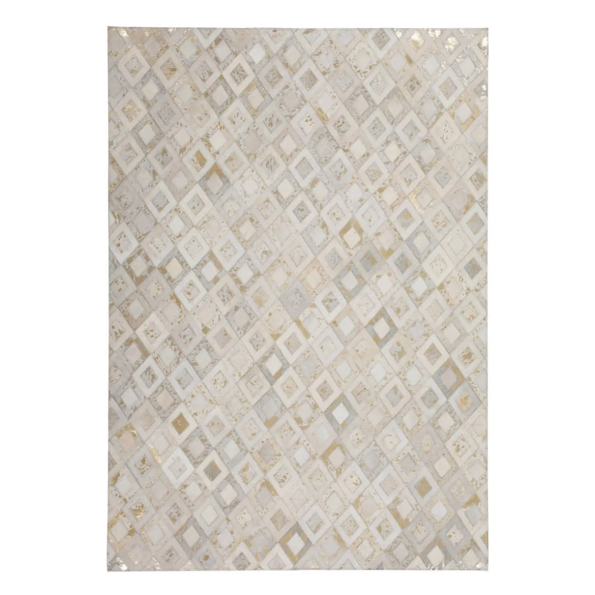 Lederteppich mit Metallic-ApplikationenDer wunderschöne Lederteppich mit eingearbeiteten Applikationen aus metallischer Folie rundet jeden edlen Einrichtungsstil gekonnt ab. Der hochwertige Edel-Teppich aus 100 % Leder überträgt einen individuellen Touch auf seine Umgebung und erzeugt ein ganz besonderes Flair. Von Hand gefertigt ist jeder einzelne Lederteppich ein Unikat. Die Verwendung von edlen Naturmaterialien und die hochwertige Verarbeitung sorgen für ein dynamisches Aussehen und machen jeden Teppich einzigartig, denn bei Naturprodukten kann es in Form, Farbe und Muster zu Abweichungen von bis zu 30 % kommen. Das natürliche Fell kann nach einiger Zeit und bei hoher Beanspruchung gegebenenfalls an Haaren verlieren. Ebenso könnte sich die Metallicfolie unter Umständen ablösen. Dies ist dem Naturprodukt und der Beschaffenheit des Fells geschuldet und kein Produktionsfehler.Setzen Sie ein Statement mit diesem Lederteppich und machen Sie ihn zum Blickfang in Ihren vier Wänden. Er eignet sich für alle Räumlichkeiten – ob Wohnzimmer, Schlafzimmer, Diele oder Esszimmer. Das moderne Rautenmuster verleiht dem Produkt eine ganz besondere Note und kommt in Kombination mit verschiedenen Möbeln gut zur Geltung. Naturfaser-Teppiche fangen Fusselwolken ein und sind daher besonders gut für Allergiker geeignet, da sie gleich abgesaugt werden können. Der extra bequeme Lederteppich ist ein Alleskönner, der sowohl durch seine Optik als auch durch seine Haptik überzeugt.Das strapazierfähige Material macht die schwere Qualität des Teppichs aus, ist äußerst langlebig und pflegeleicht. Für einen spürbaren Wohlfühl-Effekt sorgt dabei die wärmeisolierende Eigenschaft des Leders. Verleihen Sie Ihren Räumen das gewisse Etwas und schaffen Sie Ihre eigene Relax-Insel in verschiedenen Nuancen. Selbst die kleinste Wohnung lässt sich mit diesem wundervollen Naturteppich persönlich einrichten, denn er ist in verschiedenen Größen erhältlich.