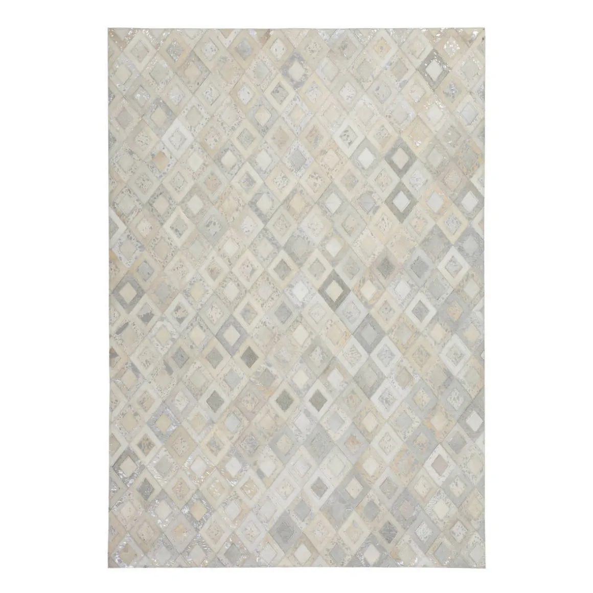 Lederteppich mit Metallic-ApplikationenDer wunderschöne Lederteppich mit eingearbeiteten Applikationen aus metallischer Folie rundet jeden edlen Einrichtungsstil gekonnt ab. Der hochwertige Edel-Teppich aus 100 % Leder überträgt einen individuellen Touch auf seine Umgebung und erzeugt ein ganz besonderes Flair. Von Hand gefertigt ist jeder einzelne Lederteppich ein Unikat. Die Verwendung von edlen Naturmaterialien und die hochwertige Verarbeitung sorgen für ein dynamisches Aussehen und machen jeden Teppich einzigartig, denn bei Naturprodukten kann es in Form, Farbe und Muster zu Abweichungen von bis zu 30 % kommen. Das natürliche Fell kann nach einiger Zeit und bei hoher Beanspruchung gegebenenfalls an Haaren verlieren. Ebenso könnte sich die Metallicfolie unter Umständen ablösen. Dies ist dem Naturprodukt und der Beschaffenheit des Fells geschuldet und kein Produktionsfehler.Setzen Sie ein Statement mit diesem Lederteppich und machen Sie ihn zum Blickfang in Ihren vier Wänden. Er eignet sich für alle Räumlichkeiten – ob Wohnzimmer, Schlafzimmer, Diele oder Esszimmer. Das moderne Rautenmuster verleiht dem Produkt eine ganz besondere Note und kommt in Kombination mit verschiedenen Möbeln gut zur Geltung. Naturfaser-Teppiche fangen Fusselwolken ein und sind daher besonders gut für Allergiker geeignet, da sie gleich abgesaugt werden können. Der extra bequeme Lederteppich ist ein Alleskönner, der sowohl durch seine Optik als auch durch seine Haptik überzeugt.Das strapazierfähige Material macht die schwere Qualität des Teppichs aus, ist äußerst langlebig und pflegeleicht. Für einen spürbaren Wohlfühl-Effekt sorgt dabei die wärmeisolierende Eigenschaft des Leders. Verleihen Sie Ihren Räumen das gewisse Etwas und schaffen Sie Ihre eigene Relax-Insel in verschiedenen Nuancen. Selbst die kleinste Wohnung lässt sich mit diesem wundervollen Naturteppich persönlich einrichten, denn er ist in verschiedenen Größen erhältlich.