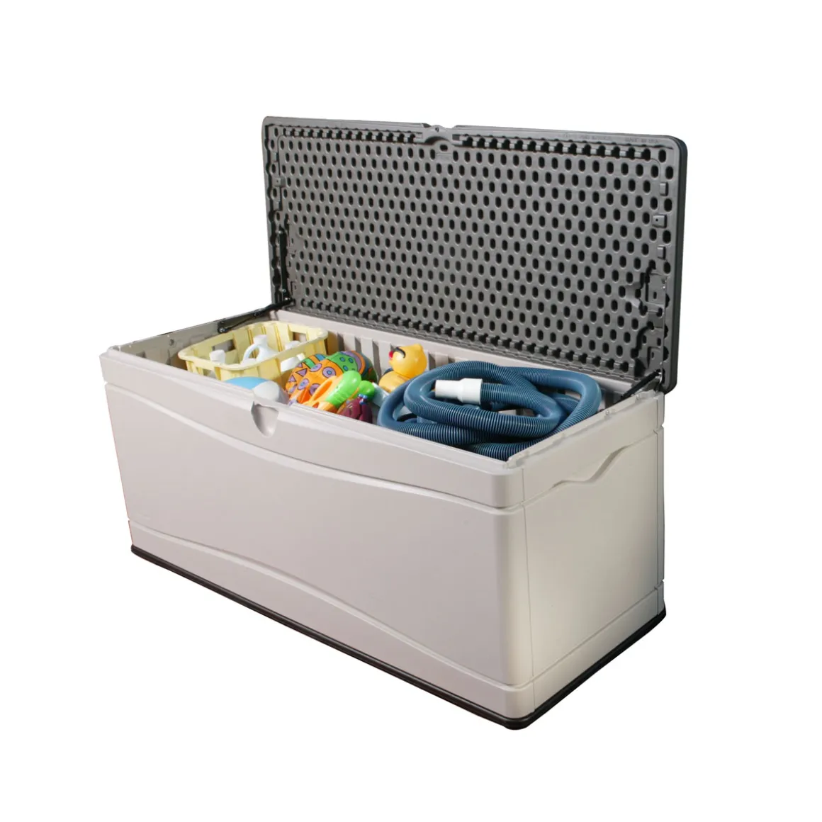 Diese extrem stabile Truhe aus Polyethylen-Kunststoff ist aufwändig in Wabentechnik gebaut. Durch die doppelwandige, 26 mm starke Konstruktion sind sowohl Wände als auch Deckel stabil versteift. So ist diese Truhe mit bis zu 402 kg belastbar! Perfekt auch als Anrichte für Ihr Büffet — und sogar als Sitzbank. Packt ca. 500 l (statt üblicher 300-400 l). Kissen, Gartenutensilien, Spielsachen, Pool-Zubehör, … sind in der ganzjährig outdoor-tauglichen Truhe perfekt verstaut. Der Inhalt wird sauber und trocken gelagert. Nichts kann schimmeln, verschmutzen oder Stockflecken bilden. Gasdruckdämpfer halten den Deckel aufrecht. Der geöffnete Deckel bleibt im Winkel von 90° stehen und kann bequem heruntergedrückt werden. So ist die Truhe viel komfortabler zu öffnen und zu bestücken. In universell kombinierbarem Grau-Ton. Mit Vorhängeschloss-Vorrichtung. Wasserabweisend, 100 % UV-beständig, farbtreu und pflegeleicht abwaschbar.