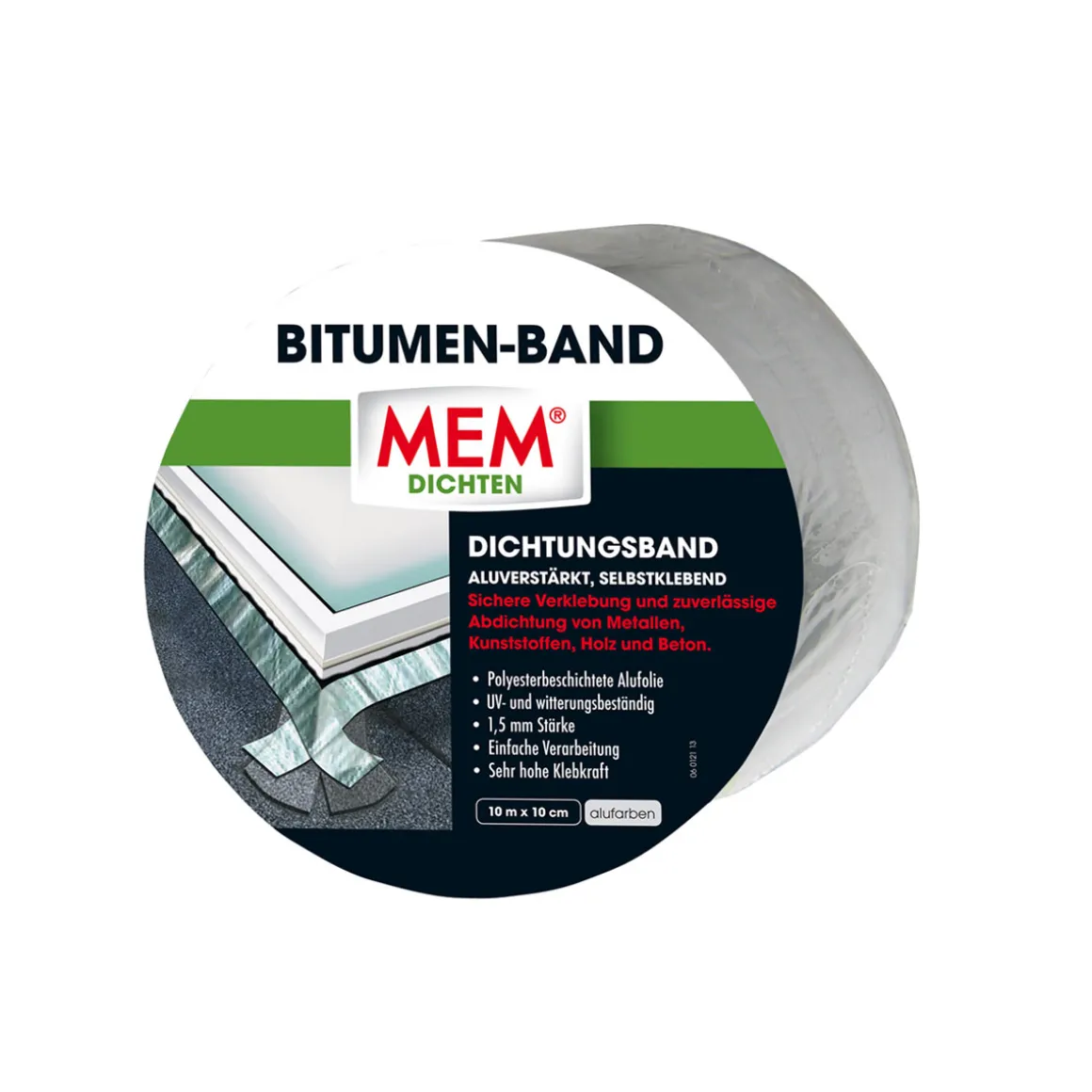 Mit dem selbstklebenden alukaschierten MEM Bitumen-Dichtband können Sie Fugen, Regenrinnen, Dachabdeckungen und Gewächshäuser sicher abdichten. Das Band ist feuchtigkeitsbeständig, UV- und witterungsbeständig sowie aluverstärkt. Es klebt sofort bei einer Verarbeitungstemperatur von ca. +5°C bis +45°C.