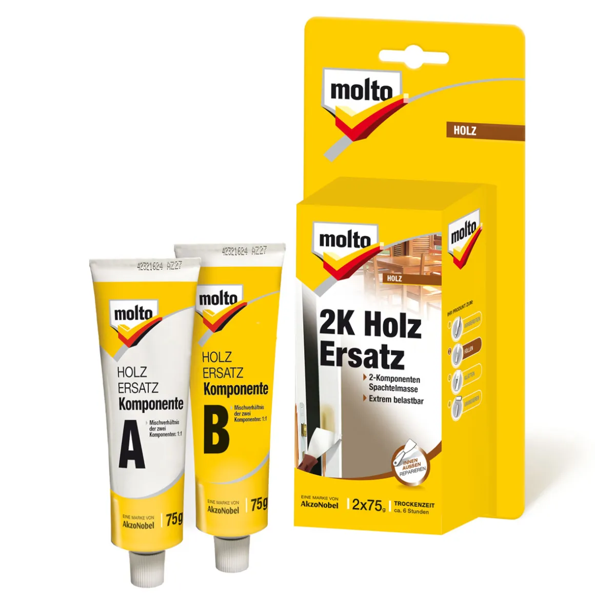 - Molto Holz-Ersatz ist ein Fertigspachtel mit einem Inhalt von 150 ml.