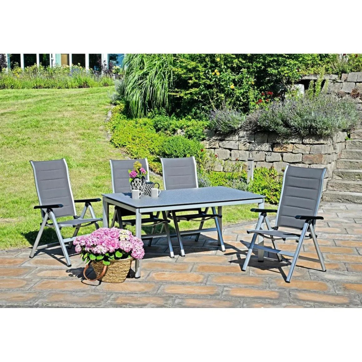 Genießen Sie den Sommer mit dem MWH Gartentisch Elemento in Silber. Mit seiner grauen Tischplatte aus Creatop und dem robusten Aluminiumgestell bietet er Platz für bis zu sechs Personen und ist perfekt für gemütliche Grillabende im Freien.
