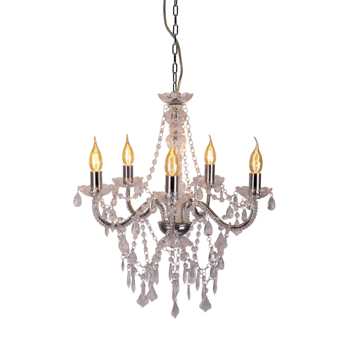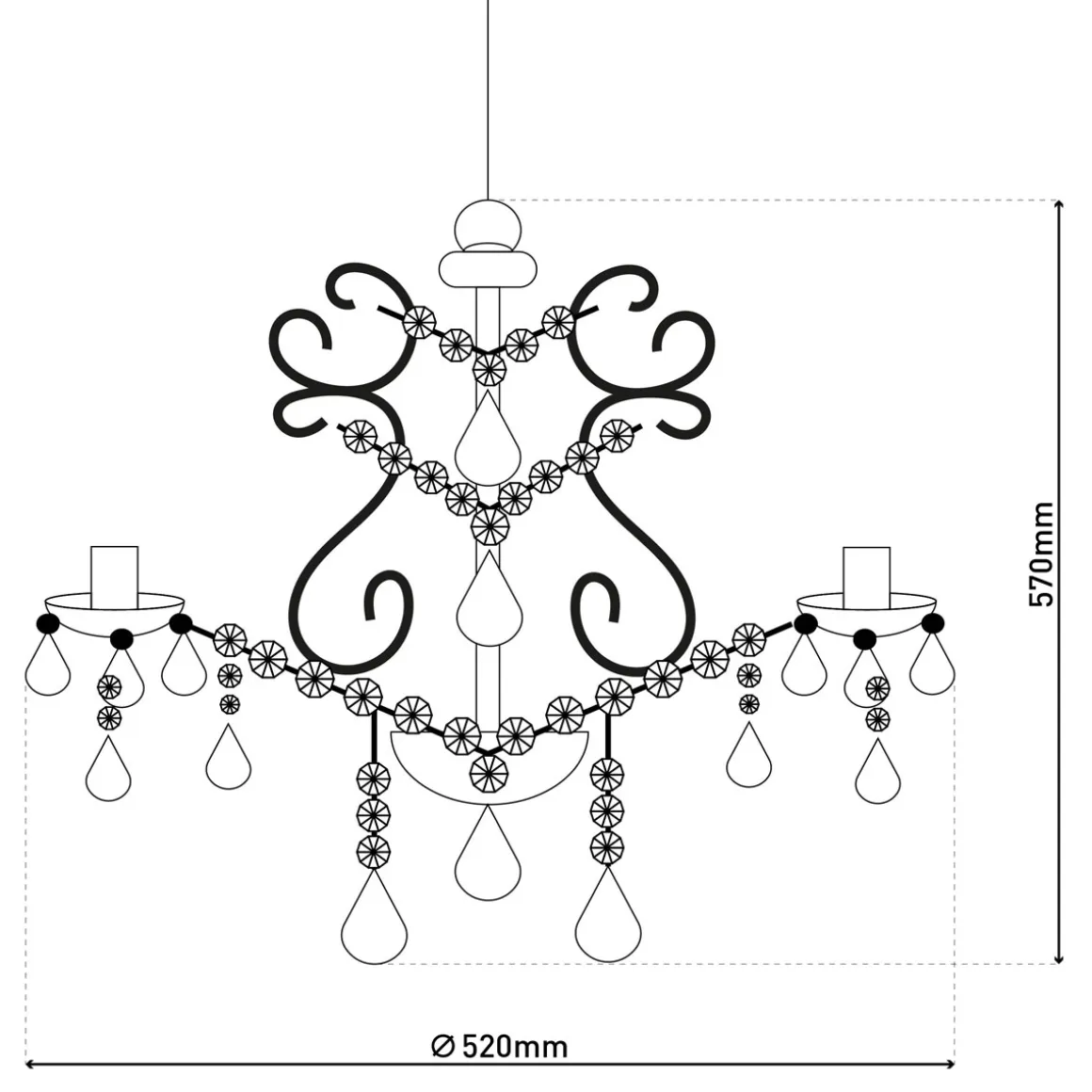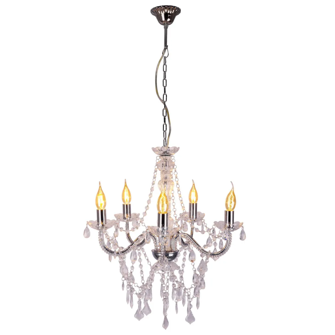 Die CECILIA Pendelleuchte aus unserer Kollektion ist ein echter Hingucker für jeden Wohnraum. Mit ihnen schaffen Sie eine klare und fokussierte Beleuchtung – optimal für Esstische, Kücheninseln, Arbeitsbereiche oder jeden Bereich, der gezieltes Licht benötigt. Sie helfen, eine bestimmte Zone hervorzuheben und schaffen eine klare Lichtquelle für Tätigkeiten. Diese Leuchte im Romantic Style überzeugt mit ihrer arabesken Optik und ihrer abgestuften Gestaltung – ideal für alle, die das Besondere lieben. Die chrome Leuchte aus Metall und Kunststoff zieht sofort alle Blicke auf sich. Das verchromte Gestell und der durchsichtige, klare Schirm bilden eine perfekte Einheit. Die Pendelleuchte hat einen Durchmesser von 52 cm und eine Höhe von 85 cm. Die Gesamtlänge des Pendels beträgt 52 cm. Diese Pendelleuchte ist die perfekte Lösung für Ihre Innenraumbeleuchtung. Mit der Option, das Leuchtmittel selbst auszutauschen, sind Sie nicht nur unabhängig, sondern schonen auch Ihren Geldbeutel. Dieses Produkt entspricht Klasse 1 und hat die Schutzart IP20.Für den Netzbetrieb dieses Geräts wird eine Netzspannung von 220-240V ~ 50Hz benötigt. Die Leuchte verfügt über eine Gesamtleistung von 200 Watt.