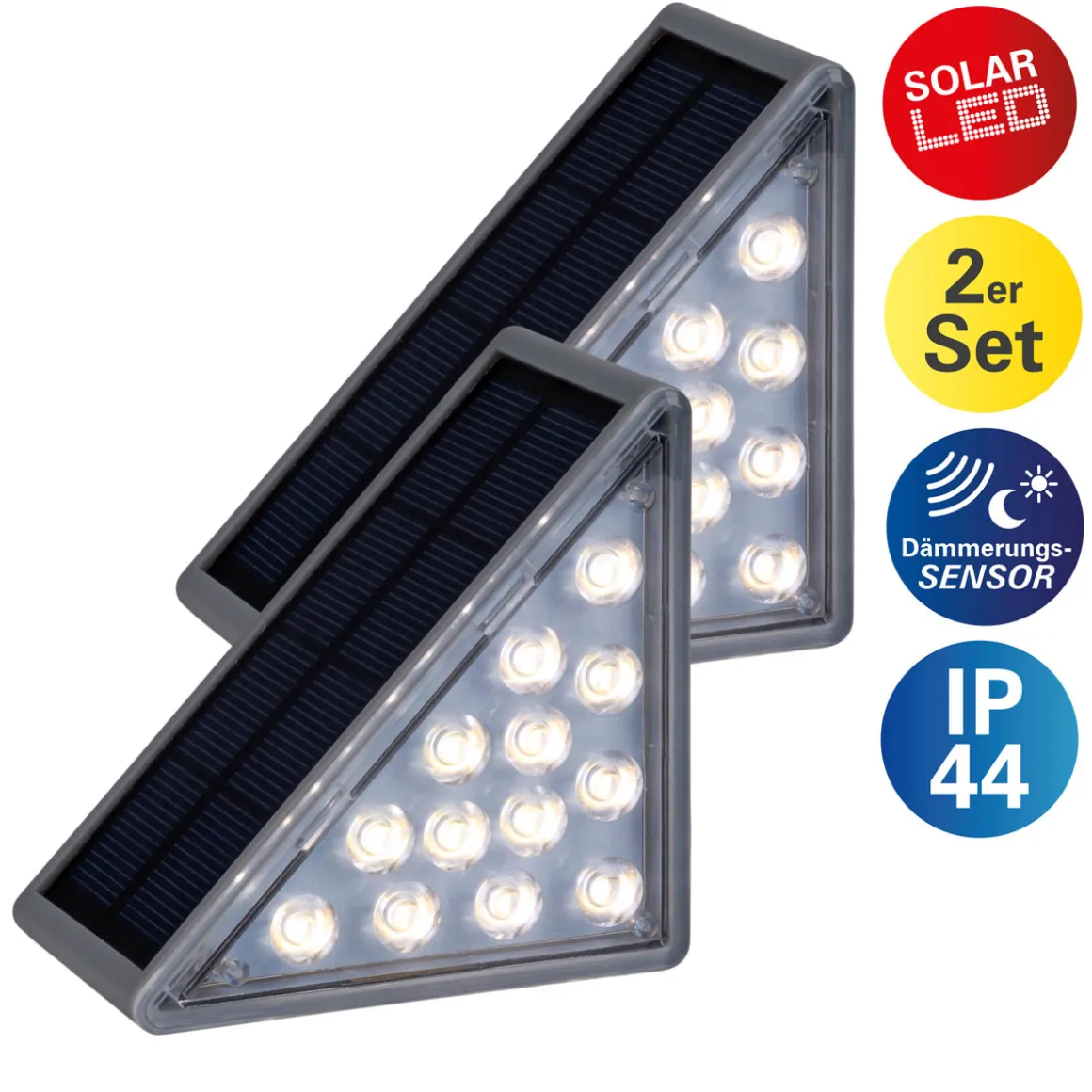 Mit der Solarleuchte SCALA setzen Sie wundervolle Akzente rund ums Haus. Diese Leuchte im Modern Style ist die optimale Wahl für alle, die es reduziert und dreieckig mögen. Die Solarleuchte aus Kunststoff ist eine elegante Beleuchtungsmöglichkeit für Ihr Zuhause. Sie ist in klassischem grau gehalten und kann somit universell eingesetzt werden. Die Maße betragen 11 cm x 5,2 cm x 6,2 cm. Solarleuchten sind die perfekte Lösung, um Ihren Garten oder Ihre Terrasse zu beleuchten. Diese hier ist mit einer LED Platine ausgestattet und sehr ansprechend gestaltet. Die Beleuchtung ist vollständig in das Design integriert. Dieses Produkt entspricht der Klasse 3 und der Schutzart IP44. Es bietet somit einen erhöhten Schutz vor Staub. Mit einer Batterie des Typs Ni-MH im AA Format und einer Akkukapazität von 800 mAh hat die Leuchte eine sehr lange Leuchtzeit. Die Außenleuchte verfügt über eine Gesamt-Lumenleistung von 6 und eine angenehme Lichttemperatur von 3000 Kelvin. Nie wieder im Dunkeln tappen: Der praktische Dämmerungssensor sorgt dafür, dass die Leuchte immer zur richtigen Zeit aktiv wird. Bei der Wahl der Solarleuchte treffen Sie eine gute Wahl. Sie werden lange Freude an der Leuchte haben und gleichzeitig von einer nachhaltigen und energiesparenden Beleuchtung profitieren.