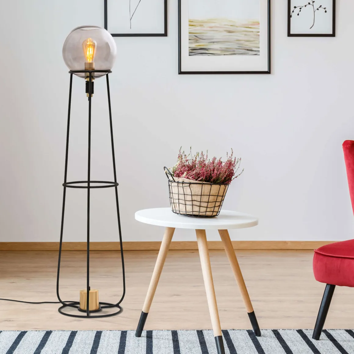 Verleihen Sie Ihrem Zuhause mit der STELO Stehleuchte das gewisse Etwas. Sie sind flexibel im Einsatz, sie können als schmückende Elemente fungieren, den Einrichtungsstil ergänzen, Kontraste setzen oder Designakzente setzen. Sie benötigen nur eine kleine Stellfläche und können in Ecken oder hinter Möbeln platziert werden, ohne viel Raum einzunehmen. Dies ist besonders vorteilhaft in kleineren Räumen oder bei begrenztem Platzangebot. Eine auffällige Optik und eine kugelförmige Gestalt machen diese Leuchte im Industrial Style zu einem Must-Have für alle, die eine stimmige Einrichtung lieben. Die schwarze Leuchte aus Metall und Glas zieht sofort alle Blicke auf sich. Die Stehleuchte misst 31 cm in der Länge, 31 cm in der Breite und 128,5 cm in der Höhe. Die Stehleuchte verfügt über einen Druckschalter und einen Euro-Flachstecker. Die Zuleitung hat eine Länge von 150 cm. Diese Stehleuchte ist nicht nur ein optisches Highlight, sondern eröffnet durch die E27 Fassung eine große Auswahl bezüglich Helligkeit und Lichttemperatur. Mit der Option, das Leuchtmittel selbst auszutauschen, sind Sie nicht nur unabhängig, sondern schonen auch Ihren Geldbeutel. Dieses Produkt entspricht Klasse 2 und hat die Schutzart IP20.Für den Netzbetrieb dieses Geräts wird eine Netzspannung von 220-240V ~ 50Hz benötigt. Die Leuchte hat eine Gesamtleistung von 40 Watt.