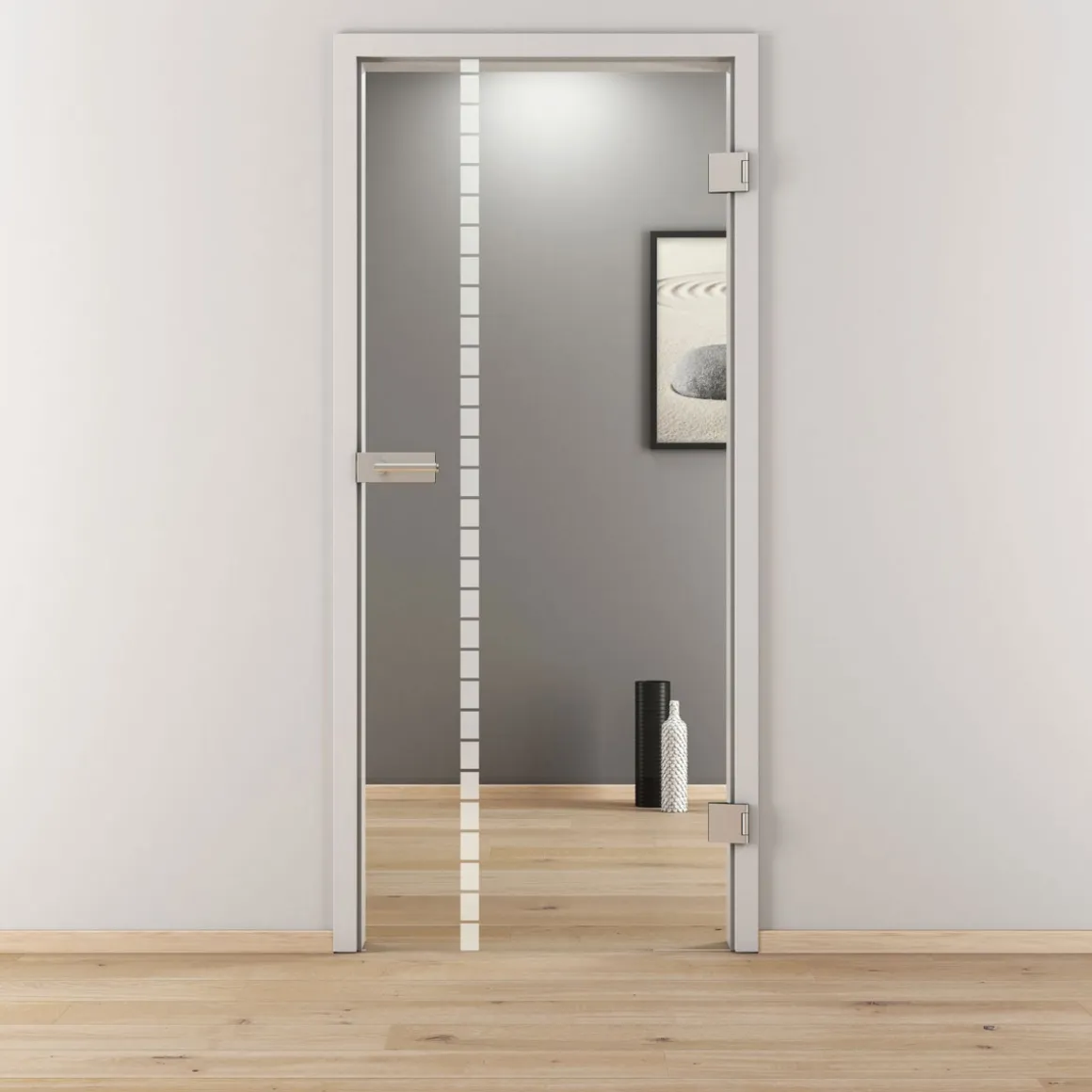 Lassen Sie Ihr Zuhause in neuem Glanz erstrahlen! Die Novadoors Glasdrehtür NOVA 598 klar ist nicht nur eine Tür, sondern ein echtes Design-Statement. Mit ihrem transparenten Einscheibensicherheitsglas und dem stilvollen Streifen-Dekor bringt sie moderne Eleganz in jeden Raum. Ob als Raumtrenner oder dekoratives Element – diese Tür überzeugt durch ihre hochwertige Verarbeitung und zeitlose Optik. Das klare Glas sorgt für lichtdurchflutete Räume, während die schmalen senkrechten Streifen einen Hauch von Raffinesse hinzufügen. Holen Sie sich mit dieser Drehtür ein Stück Luxus nach Hause und genießen Sie die perfekte Kombination aus Stil und Funktionalität.
