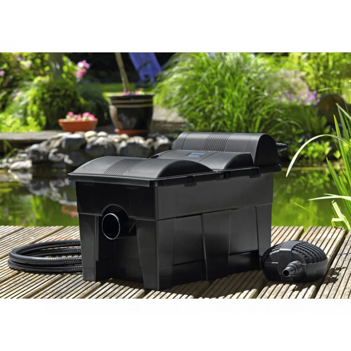 Das Komplettset eignet sich ideal für alle Kunden mit einem eigenen Gartenteich oder Koi-Teich. Es ist einfach zu installieren und bietet eine effektive Möglichkeit zur Reinigung des Wassers.