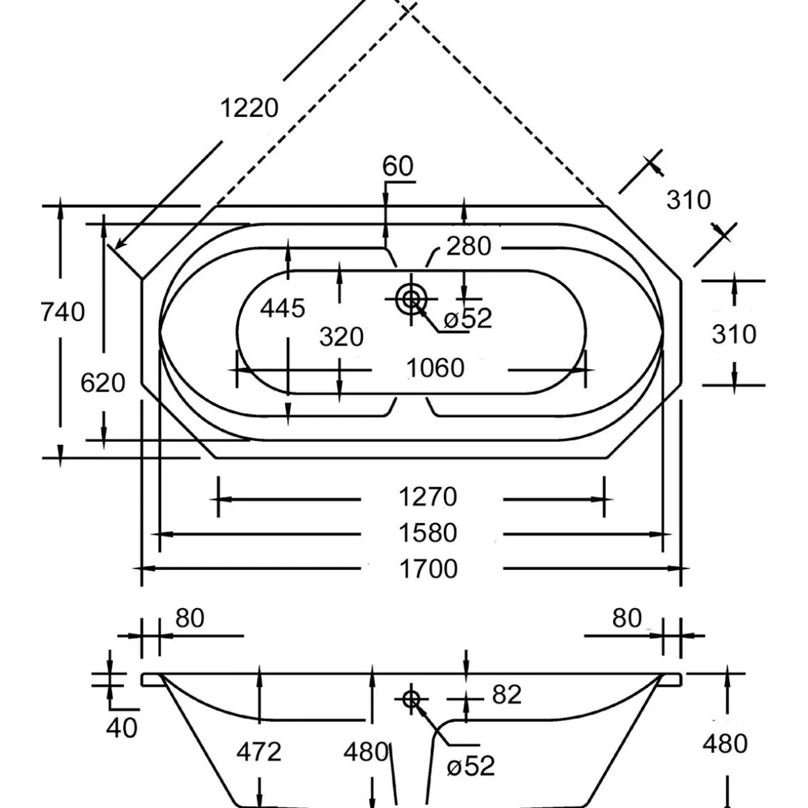 - Durchmesser Ablauf: 52 mm, seitlich mittig positioniert