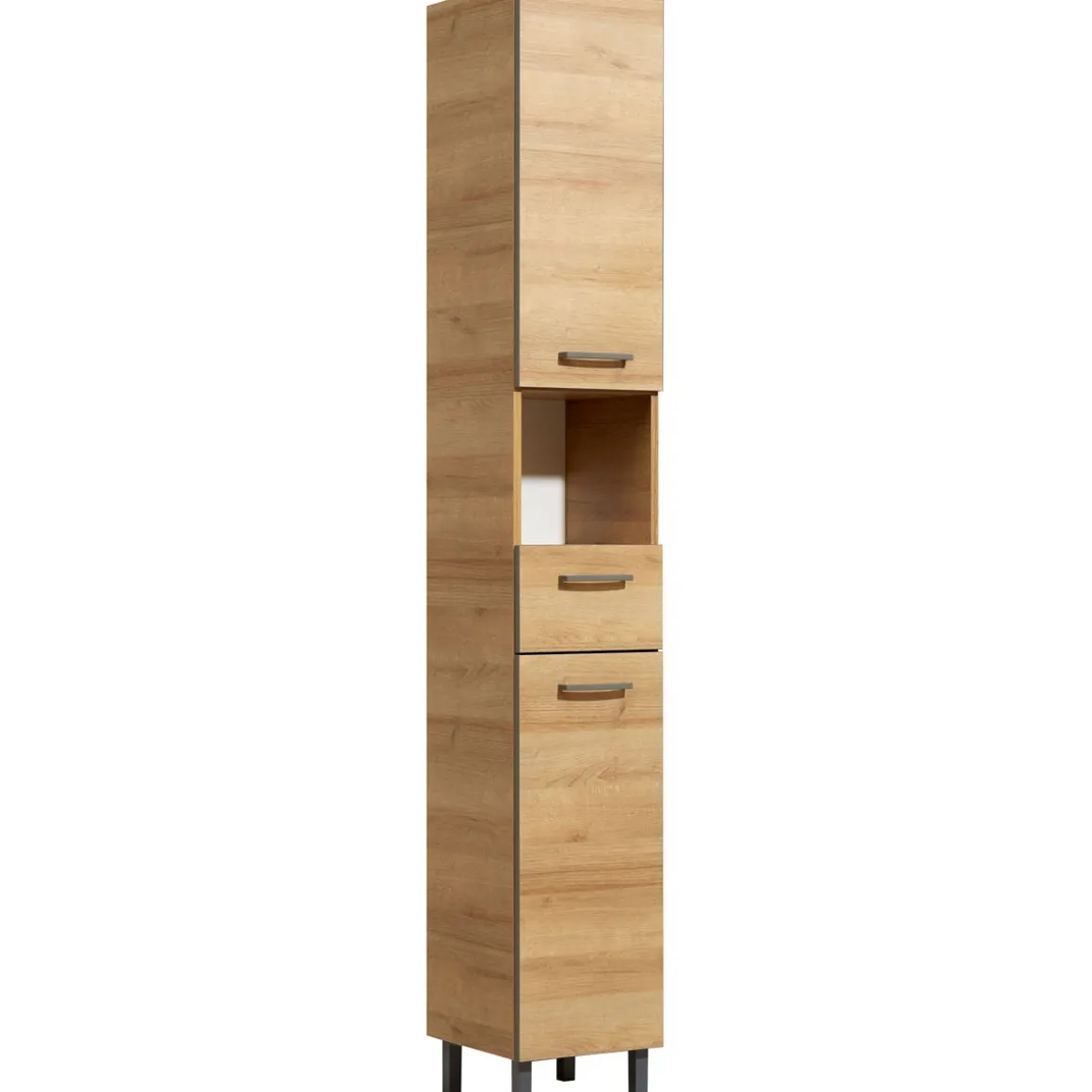 Mit dem Pelipal Hochschrank Rüdesheim holen Sie sich ein Stück Natur in Ihr Badezimmer. Die Riviera Eiche Nachbildung verleiht dem Schrank eine warme und gemütliche Ausstrahlung, während die praktische Ausstattung dafür sorgt, dass Sie alle Ihre Badutensilien ordentlich verstauen können.