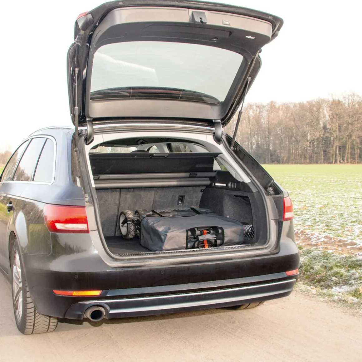 Der Bollerwagen lässt sich mit nur wenigen Handgriffen platzsparend zusammenfalten. In der praktischen Tragetasche verstaut, kann er immer problemlos mitgenommen werden und passt selbst in den kleinsten Kofferraum