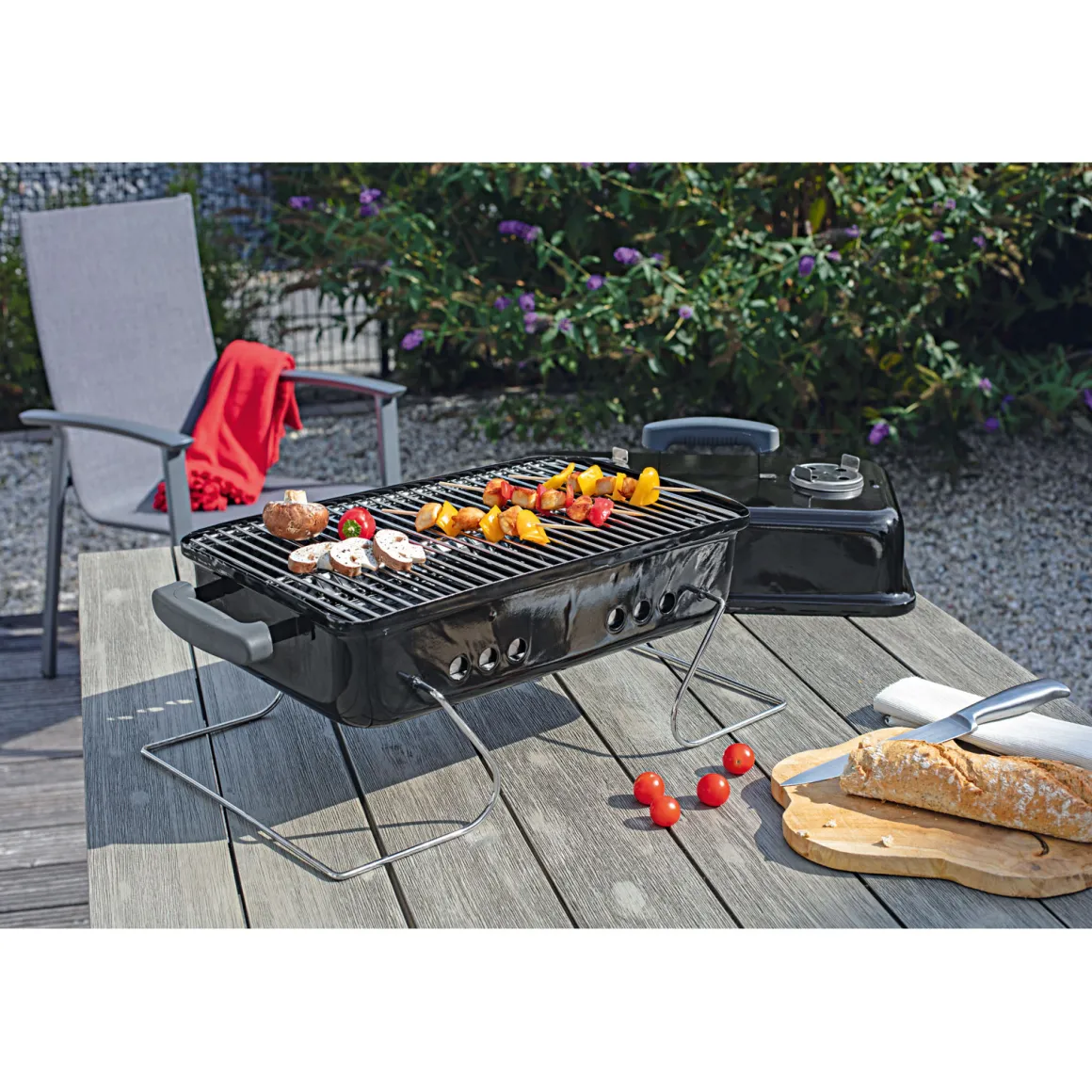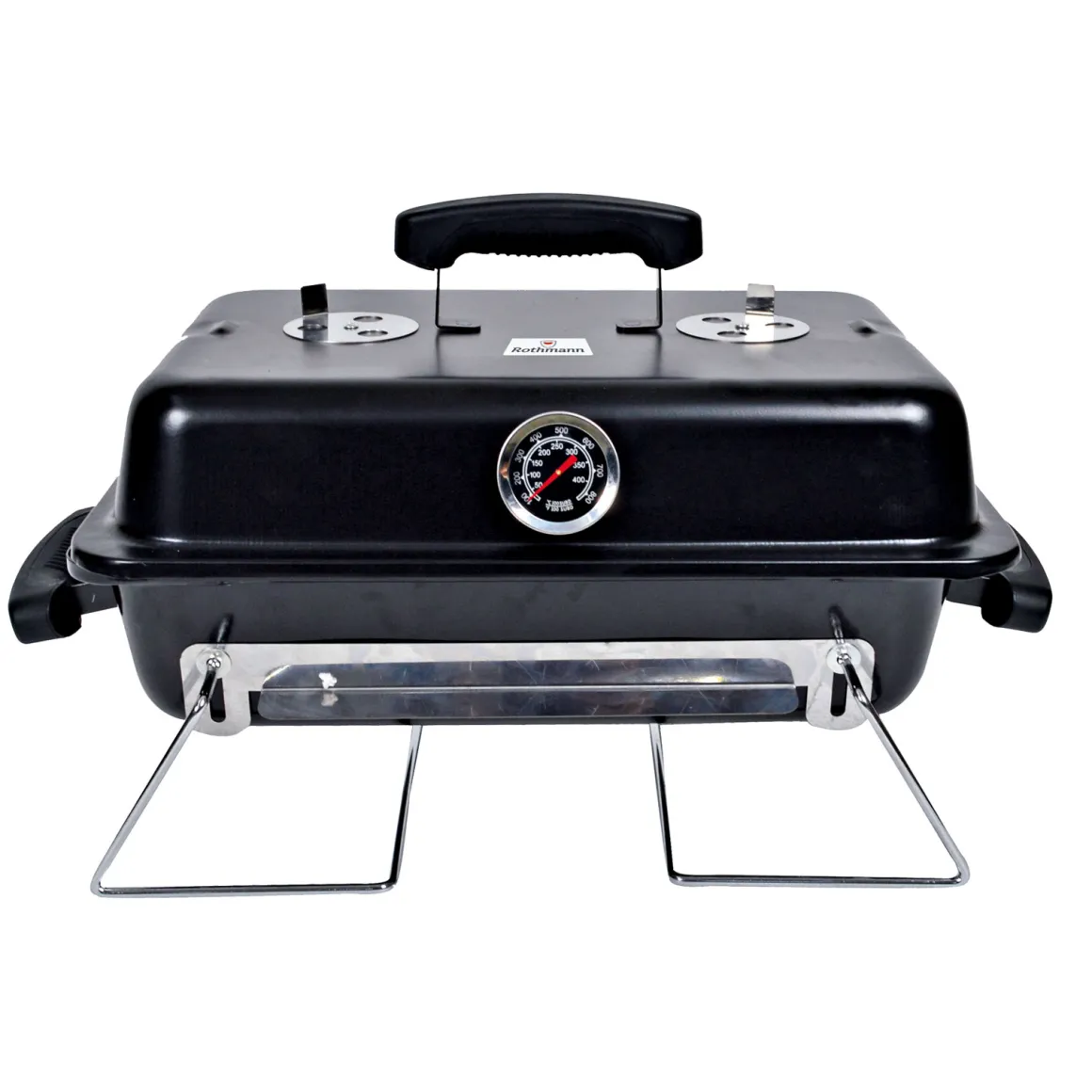 - Ausstattung: Deckelthermometer, faltbares Gestell, verchromter Grillrost