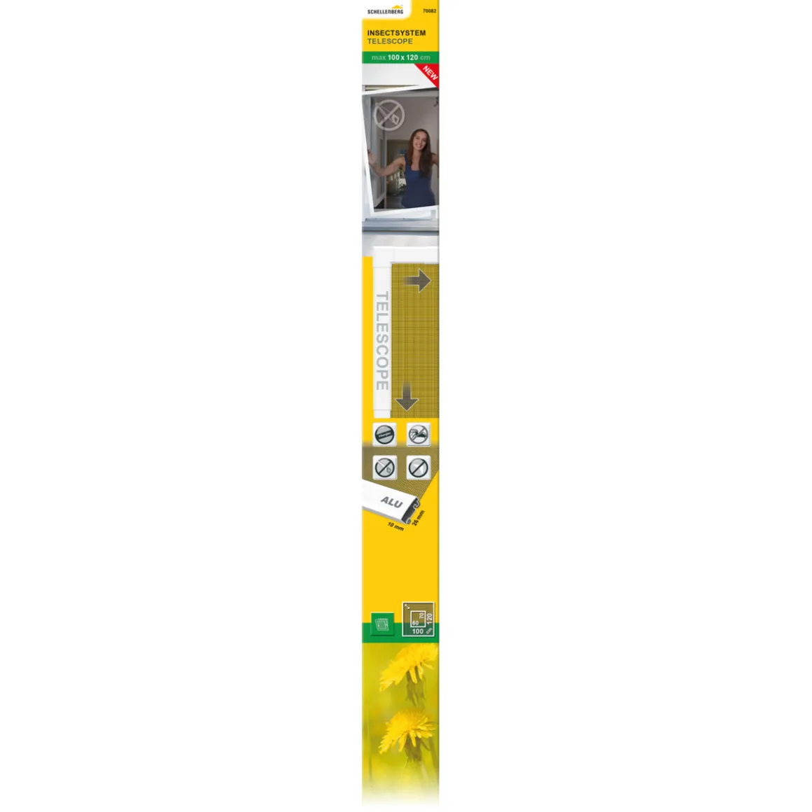 Schellenberg Fliegengitterfenster TELESCOPE, weißPassgenauer Insektenschutz mit ausziehbarem Aluminiumrahmen• reißfestes Fiberglasgewebe in Anthrazit• hochwertige, matt-sandierte Profile• umlaufende Bürstendichtung für erweiterten Schutz• schneller Zusammenbau ohne sägen oder bohren, Einhänge-Montage• ausziehbar min. 60 x 70 cm, max. 100 x 120 cm, 14 mm EinbautiefeMit dem Fliegengitterfenster TELESCOPE passen Sie den Insektenschutz individuell an Ihr Fenstermaß an, ganz ohne sägen oder bohren. Das Komplettset besteht aus ausziehbaren Aluminiumrahmenprofilen, anthrazitfarbenem Fiberglasgewebe sowie Montagezubehör. Die ausziehbaren Rahmenprofile haben eine hochwertige, matt-sandierte Oberfläche. Einen erweiterten Schutz vor kleineren Kriech- und Krabbeltieren bietet die im Rahmen zusätzlich eingezogene Bürstendichtung. Das Insektenschutzgewebe aus Fiberglas ist reißfest und bietet in Anthrazit eine optimale Durchsicht ins Freie. Die minimalen Maße des Fliegengitterfensters sind 60 x 70 cm, die maximalen Maße sind 100 x 120 cm. Der Insektenschutz wird nach dem Zusammenbau in den Fensterrahmen eingehängt und kann jederzeit wieder entfernt werden. Für den Einbau hinter einen Rolladen ist die Einbautiefe von 14 mm zu beachten.Technische Daten• Maße: min. 60 x 70 cm, max. 100 x 120 cm• Einbautiefe: 14 mm• Profilfarbe: Weiß• Profilmaterial: Aluminium• Profilstärke: 26 x 10 mm• Profilstruktur: matt-sandiert• Gewebefarbe: Anthrazit• Gewebematerial: Fiberglas/PVC• Maschenweite: 1,53 x 1,13 mm• Fadenstärke: .011 = 0,2794 mm• Offene Fläche: 67 %• Gewebegewicht: 110 g/m²• Temperaturbeständigkeit: -25 °C bis +120 °C• Feuerbeständigkeit: selbstlöschend in 10 Sek. nach Entfernen der Flamme