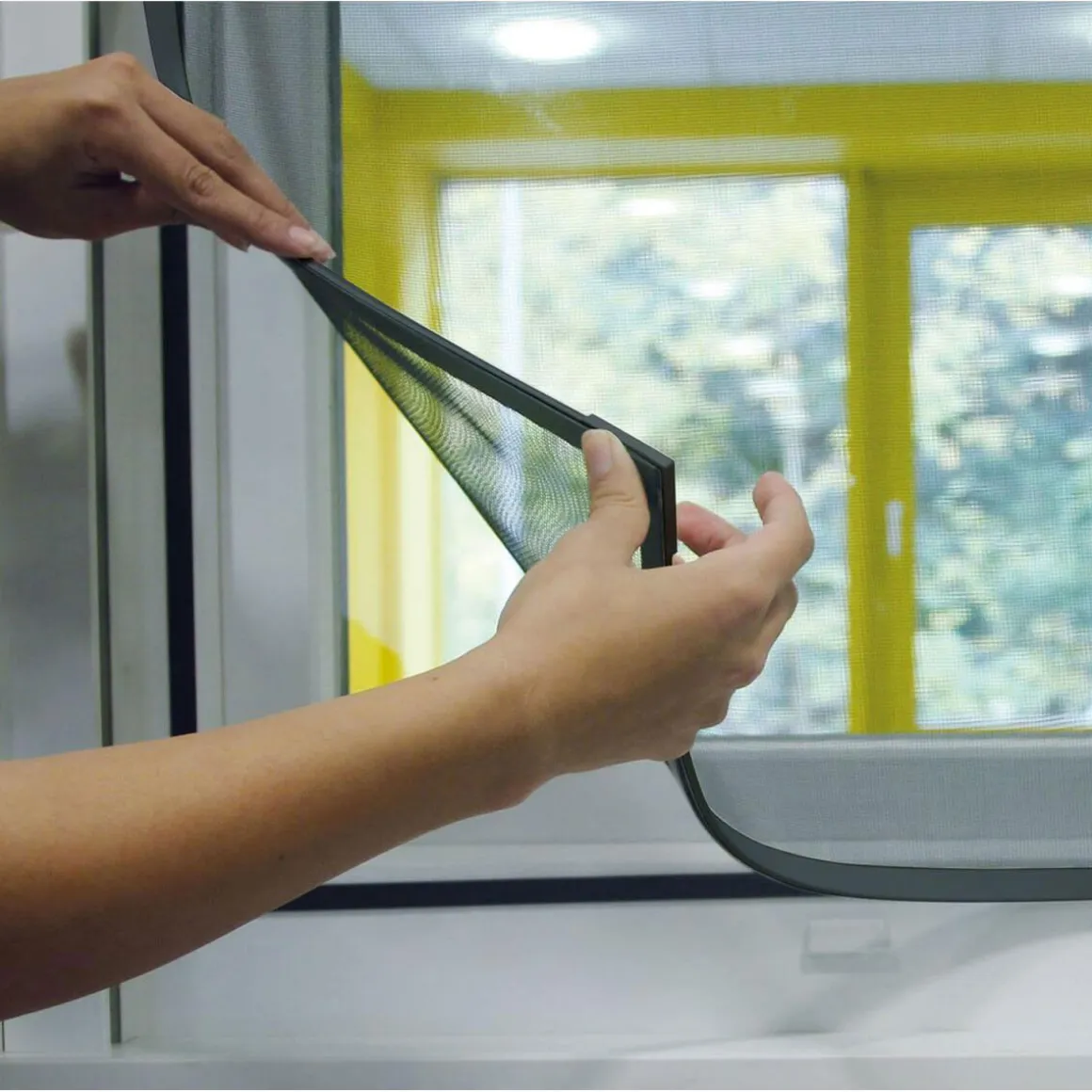 - Insektenschutz-Gewebe auf dem Rahmen platzieren und mit dem Magnetband eindrücken
