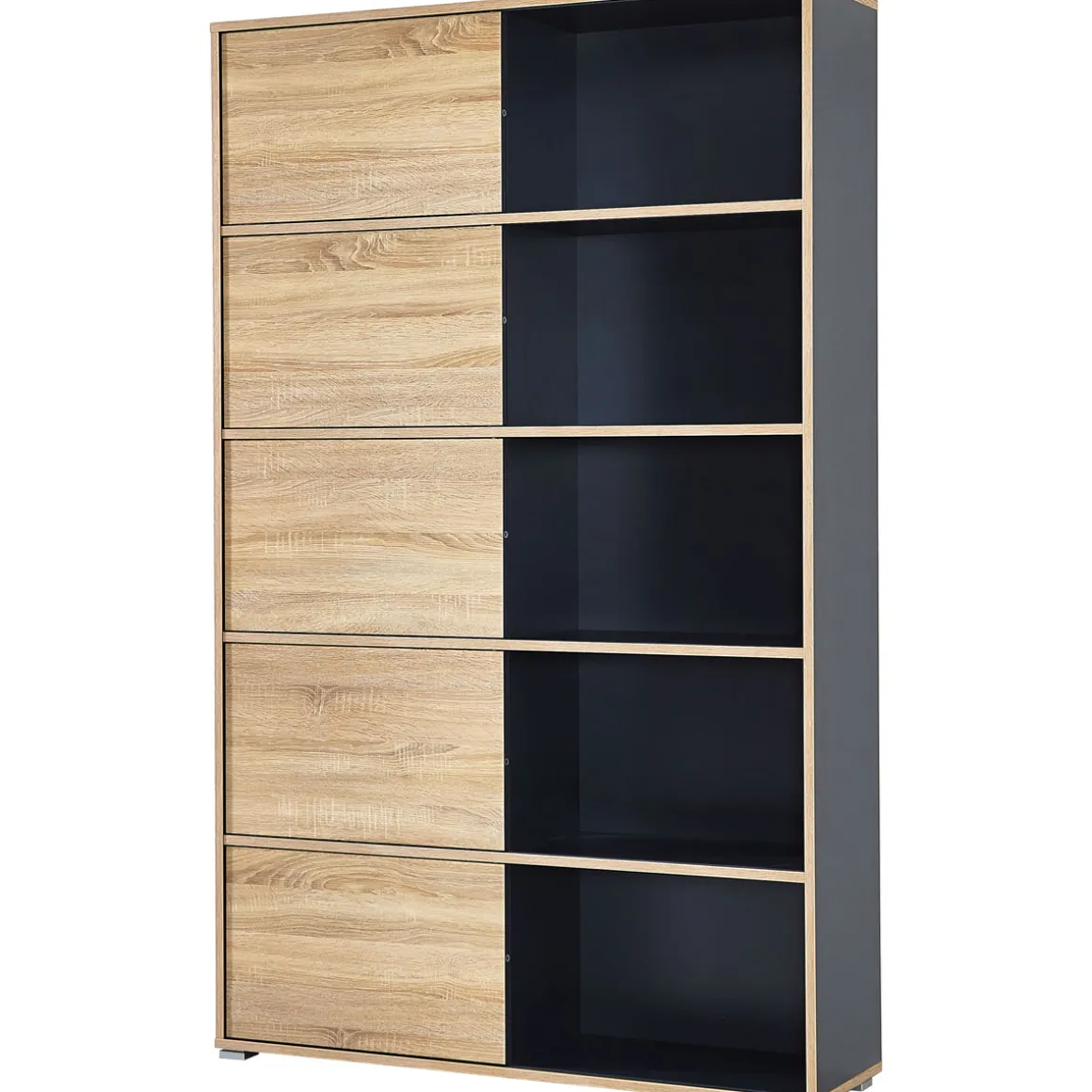Dieses Schiebetürregal ist wie geschaffen fürKunden, die Wert auf Ordnung und Stil legen! Egal ob Sie ein passionierter Bücherliebhaber sind oder einfach nach einem Möbelstück suchen, das Funktionalität mit Ästhetik verbindet – dieses Regal erfüllt alle Wünsche. Die zehn geräumigen Fächer bieten Platz für alles Wichtige: Von Aktenordnern über Haushaltsutensilien bis hin zu dekorativen Accessoires. Dank der fünf praktischen Schiebetüren bleibt alles ordentlich verborgen und dennoch griffbereit. Besonders attraktiv ist die moderne Farbkombination aus Anthrazit und Sonoma Eiche: Sie fügt sich nahtlos in unterschiedliche Einrichtungsstile ein. Und wenn Sie wenig Platz haben? Kein Problem! Mit einer Tiefe von nur 35 cm nutzt dieses Regal den verfügbaren Raum optimal aus.
