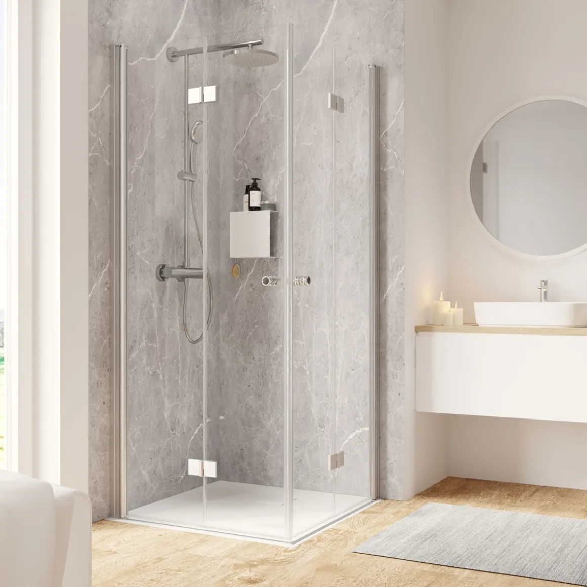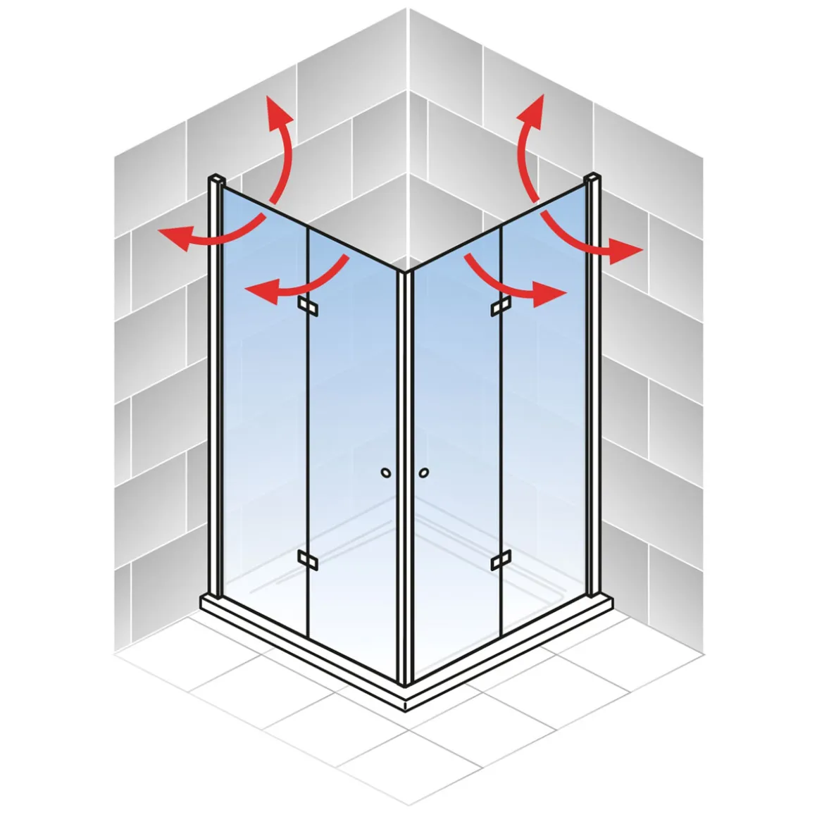 Der Garant-2.0-Drehfalttür-Eckeinstieg von Schulte ist die ideale Lösung für kleine Badezimmer, da er einen großzügigen Einstiegsbereich bietet und sich zudem platzsparend zusammenfalten lässt. Die Duschtür besteht aus insgesamt vier 6 mm starken Sicherheitsglas-Elementen (ESG), die mit formschönen Griffen über Eck geöffnet werden können. Dank der hochwertigen Materialien und der präzisen Verarbeitung ist die Drehfalttür besonders langlebig und stabil.