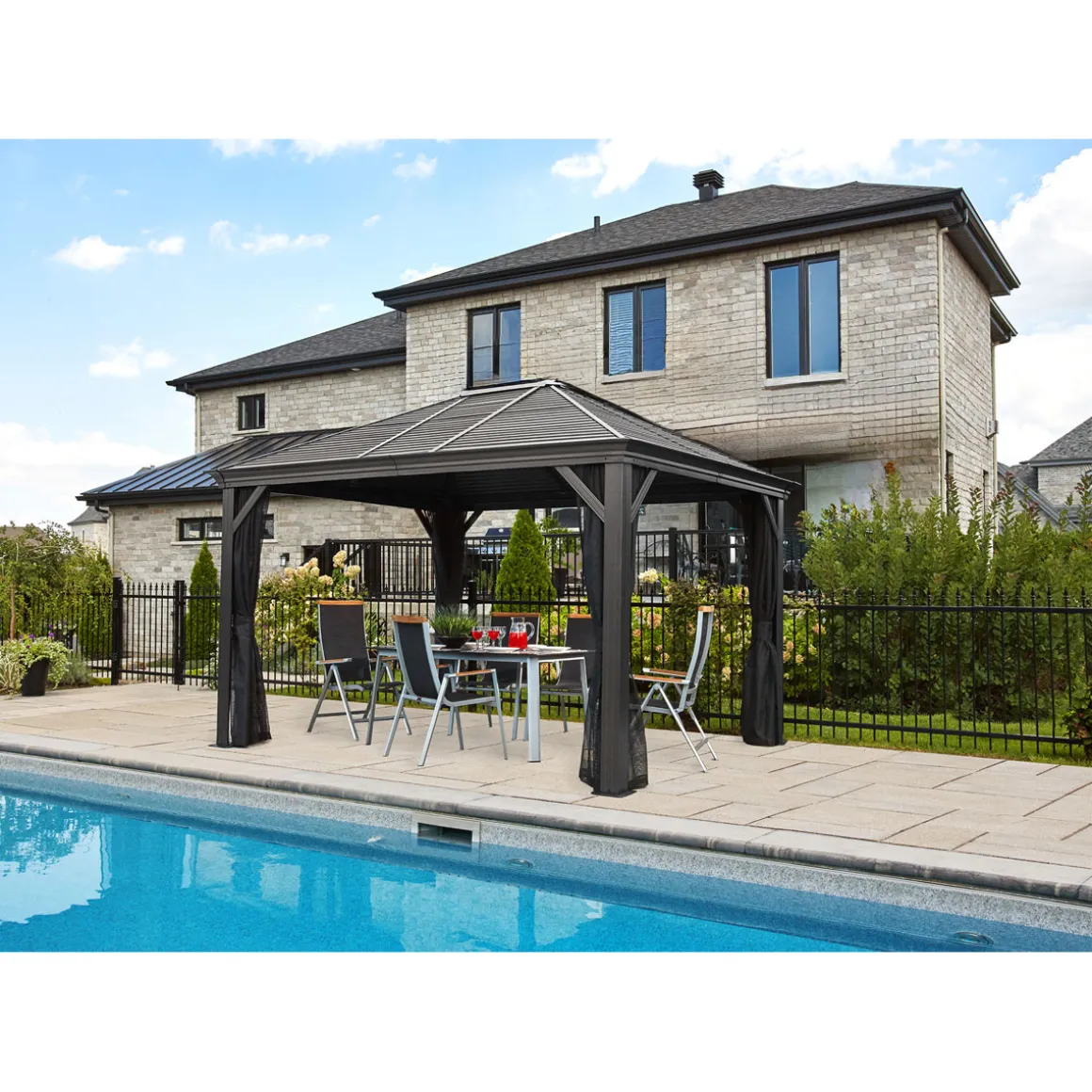 Besonderheiten: * Konzipiert für hohe Schneelasten von bis zu 150kg/m² * Doppeltes Stahldach fördert die Durchlüftung * Integrierte Regenrinne * Witterungsbeständig * Inkl. Moskitonetzen * Für den ganzjährigen Außenbetrieb entwickelt