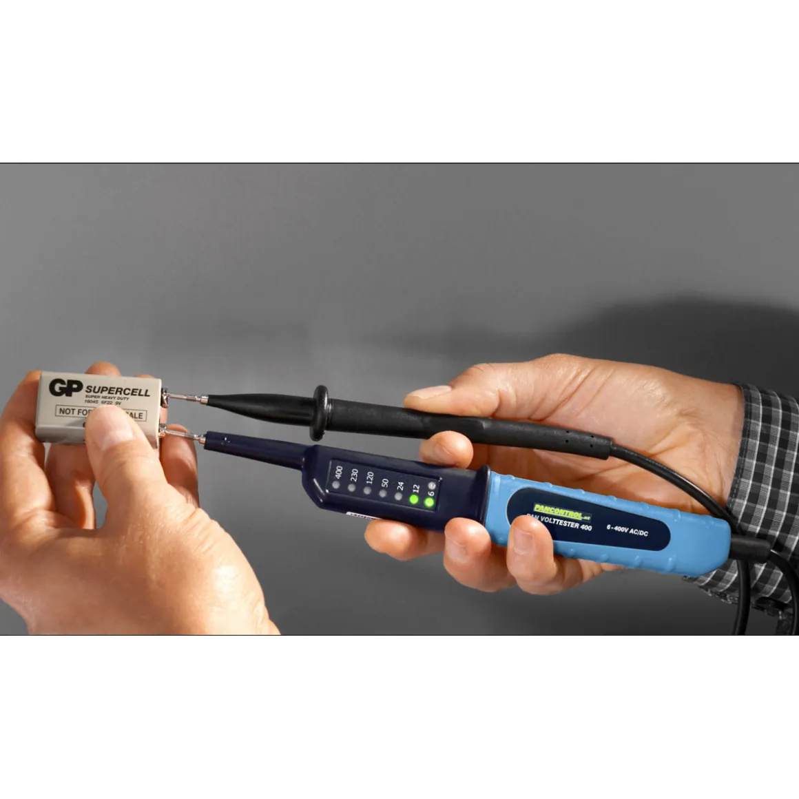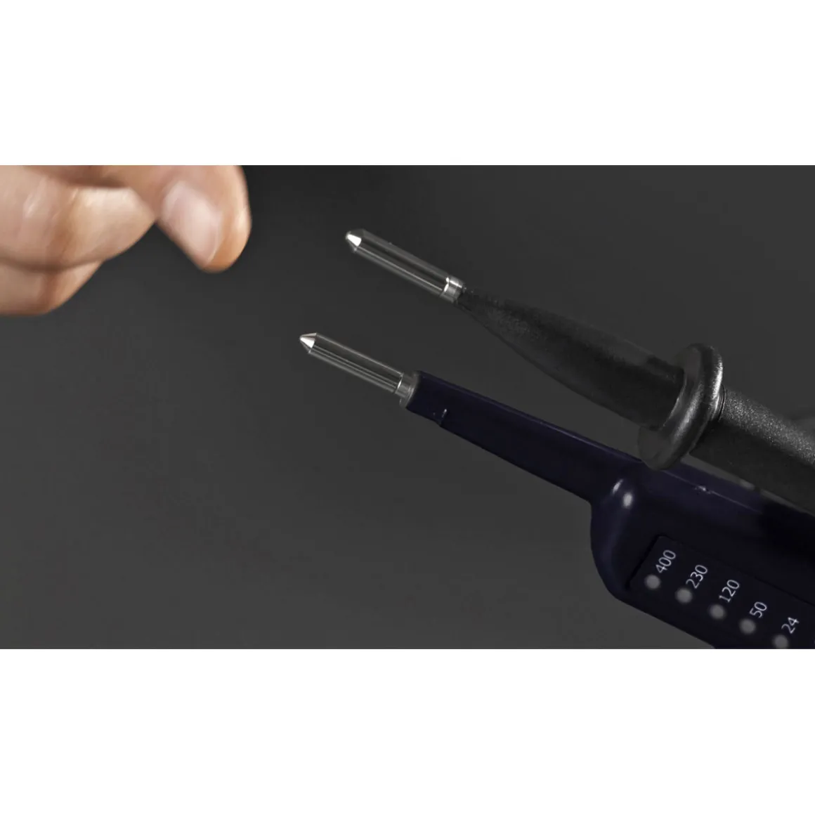 Spannungsprüfer für den Messbereich 6-400 V, mit LED-Anzeige, IP64-spritzwassergeschützt.