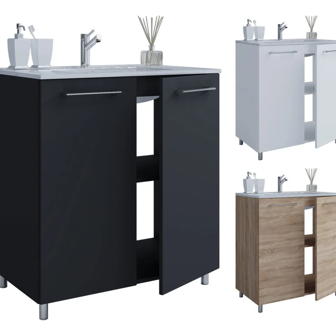 – 1x Waschbecken aus KeramikDas Badmöbel für den besonderen Blickfang im Badezimmer mit einem hochwertigem Keramik Waschbecken.Der Unterschrank mit zwei Drehtüren bietet ausreichend Stauraum für Hygieneartikel und weiteren Utensilien