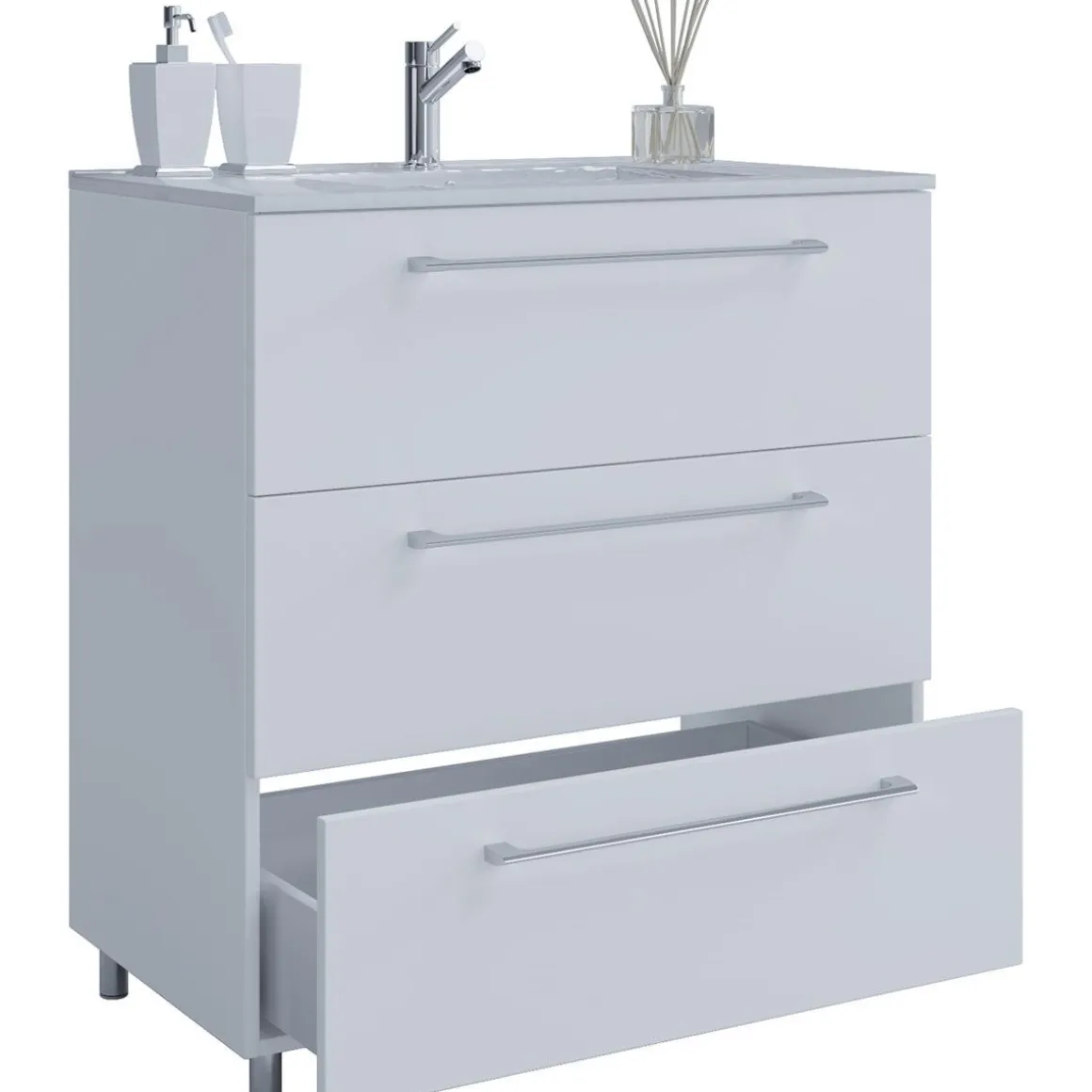 Das Badmöbel-Set besteht aus einem Unterschrank mit drei leichtgängigen Schubladen mit Metallauszügen.Ein modernes Waschbecken aus massiver Keramik runden das Möbel ab, um den perfekten Blickfang im Badezimmer zu erhalten.Waschtisch-Unterschrank: