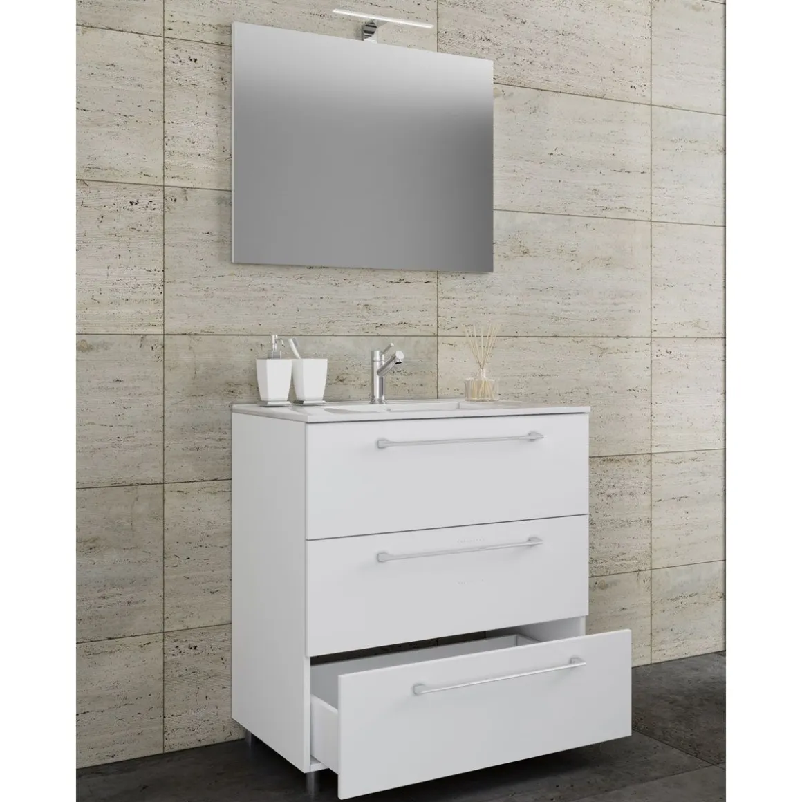 Das Badmöbel-Set besteht aus einem Unterschrank mit drei leichtgängigen Schubladen mit Metallauszügen.Ein modernes Waschbecken aus massiver Keramik und einem Spiegel aus strapazierfähigem Glas runden das Möbel ab, um den perfekten Blickfang im Badezimmer zu erhalten.Waschtisch-Unterschrank: