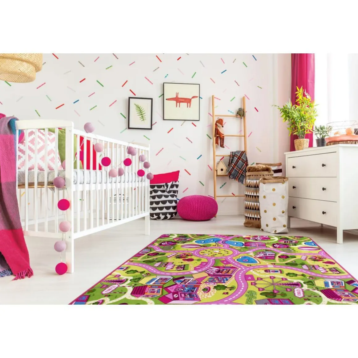 Mit dem Teppich Sweet Village holen Sie sich einen strapazierfähigen Kinderteppich ins Haus. Die gemusterte Oberfläche in Rosa, Pink und Grün sorgt für eine fröhliche Atmosphäre im Kinderzimmer oder anderen Wohnräumen. Dank seiner Pflegeleichtigkeit lässt er sich einfach reinigen. Mit einer Florhöhe von ca. 6,5 mm bietet er zudem eine angenehme Haptik beim Spielen oder Entspannen.