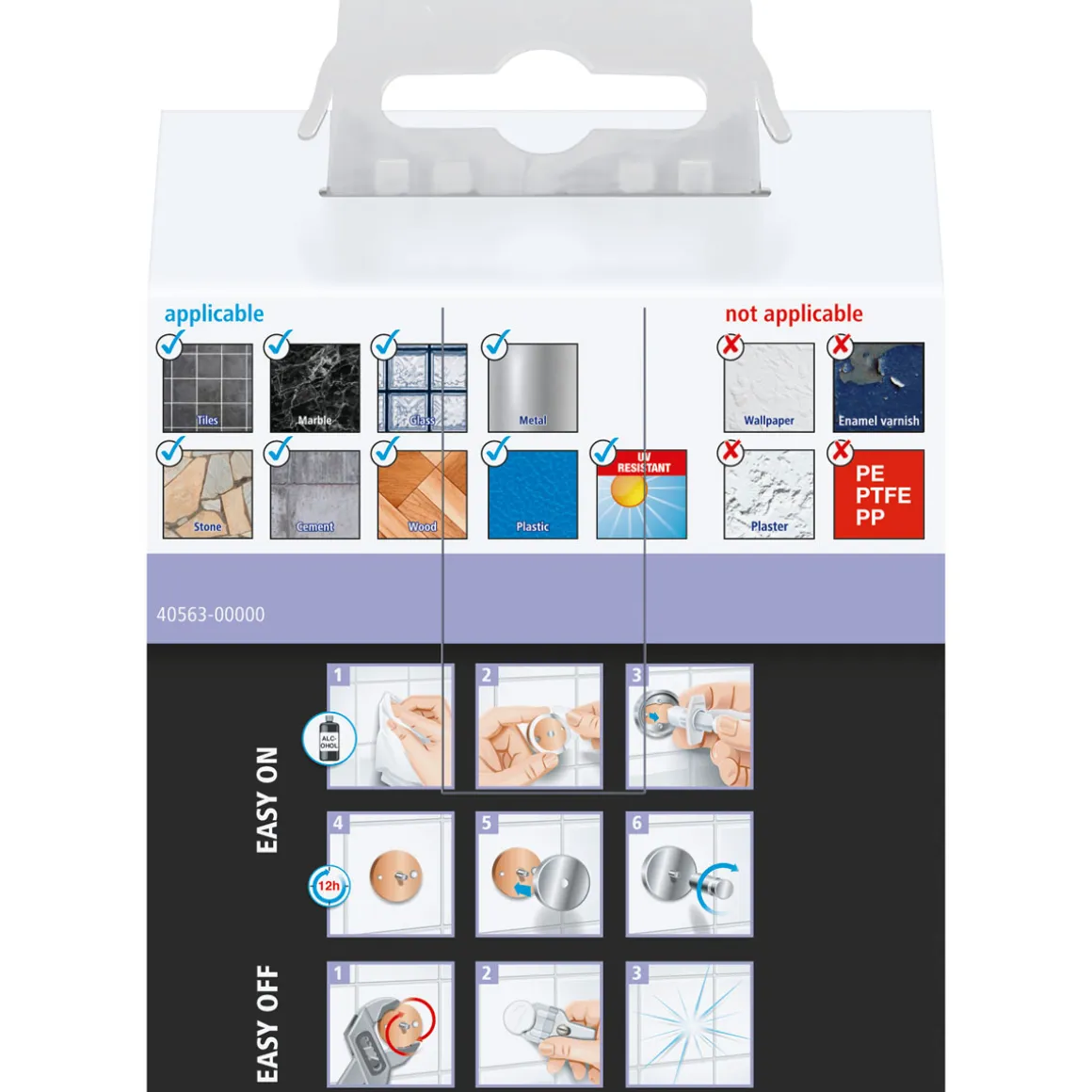 - Hält auf Fliesen, Metall, Naturstein, Marmor, Glas, Holz und vielen Kunststoffen