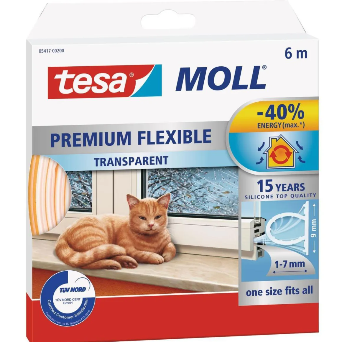 Mit dem Tesa moll Premium Flexible transparent sparen Sie bis zu 40% Heizkosten ein und schützen Ihr Zuhause vor Witterungseinflüssen. Die hohe Temperaturbeständigkeit von -50°C bis +60°C sowie die extrem hohe Witterungs-, UV- und Ozonbeständigkeit machen das Dichtungsband besonders langlebig.