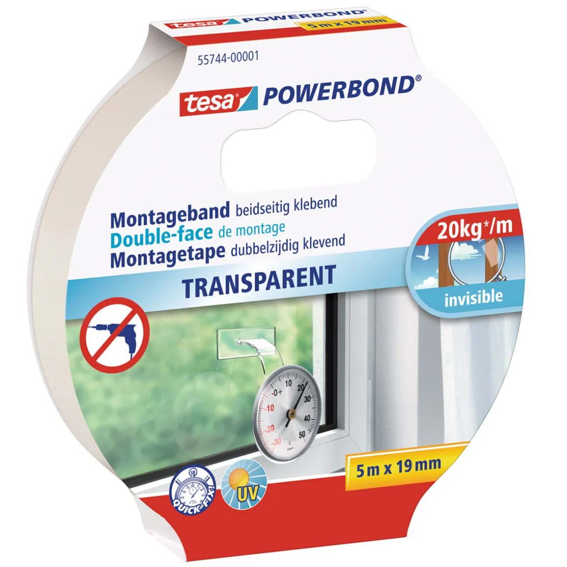 Mit Tesa Powerbond Transparent können Sie Gegenstände nahezu unsichtbar anbringen. Das transparente Montageband ist besonders dünn und lässt sich individuell zuschneiden. Es hält auf Glas, Kacheln, Putz, Holz und den meisten Kunststoffen und ist sowohl für den Innen- als auch Außenbereich geeignet.