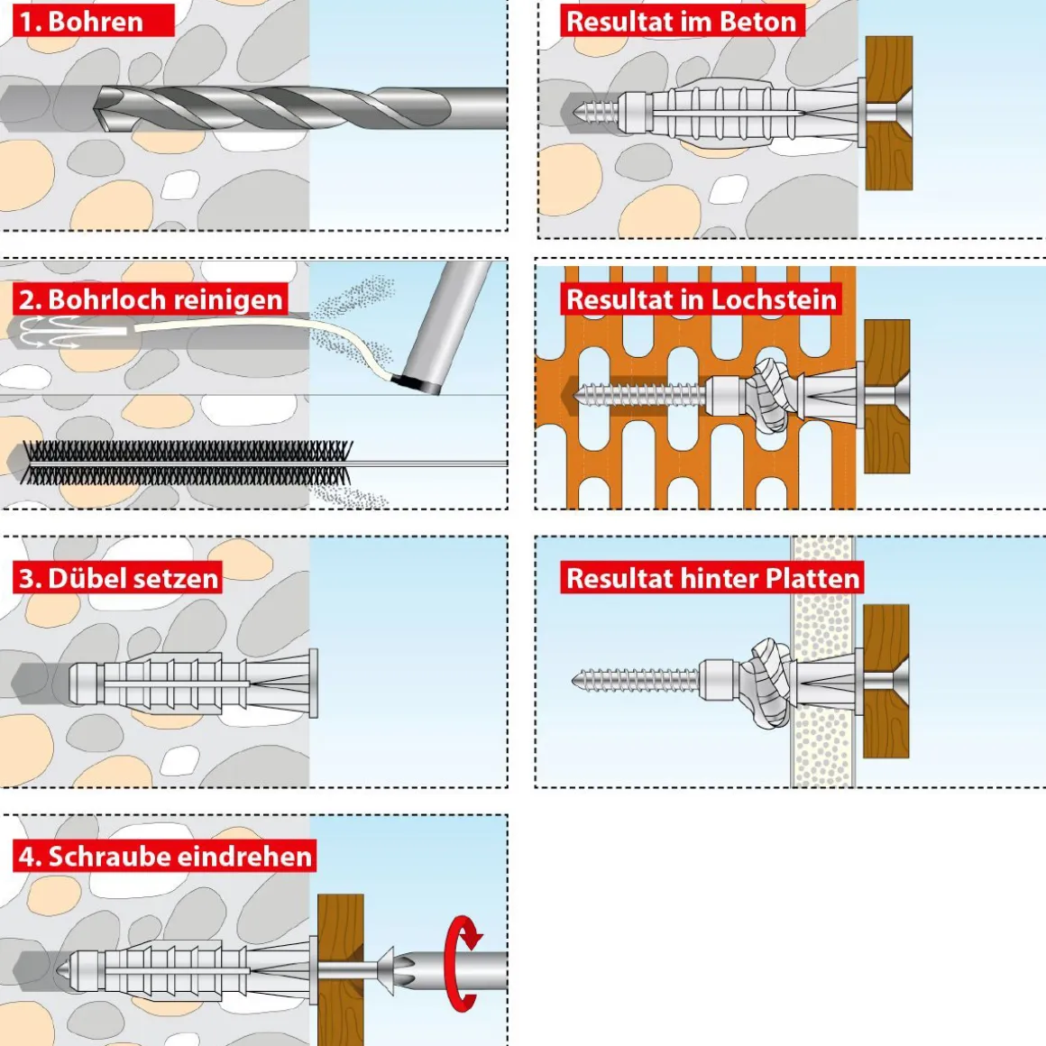 - Geeignet für: Mauerwerk, Beton, Vollstein, Hochlochziegel, Hohlblockstein, Porenbeton, Gipskartonplatte, Gipsfaserplatte