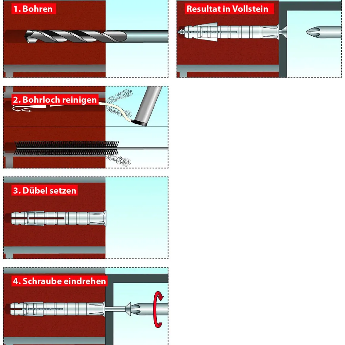 Mit dem TOX Spreizdübel Altbaujoker 8/90 können Sie Badezimmerschränkchen, Flatscreen TVs oder Wandkonsolen sicher an Beton, Sandstein, Hohllochziegel oder Vollstein befestigen. Der Dübel spreizt in mehrere Richtungen und sorgt somit für eine zuverlässige Verankerung.