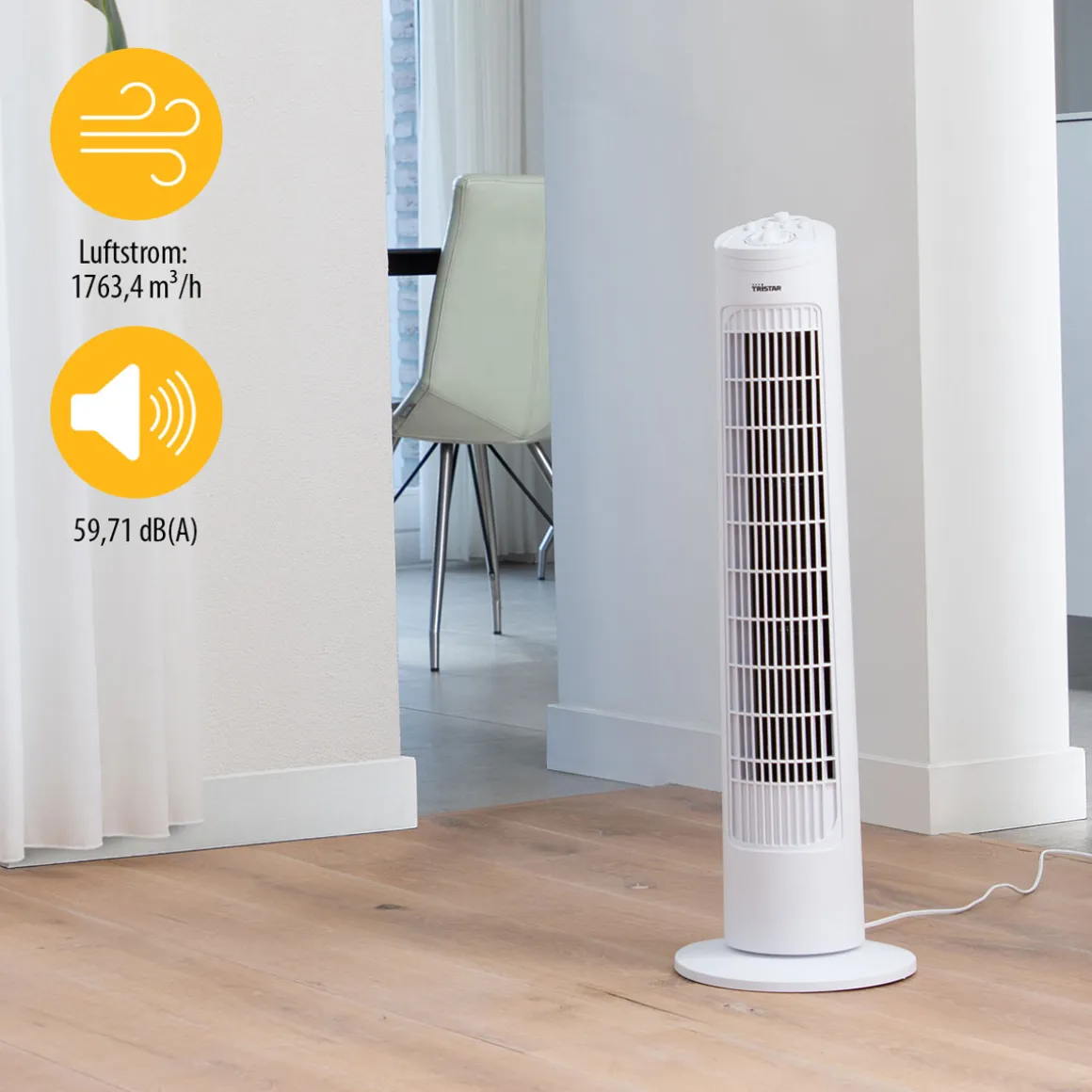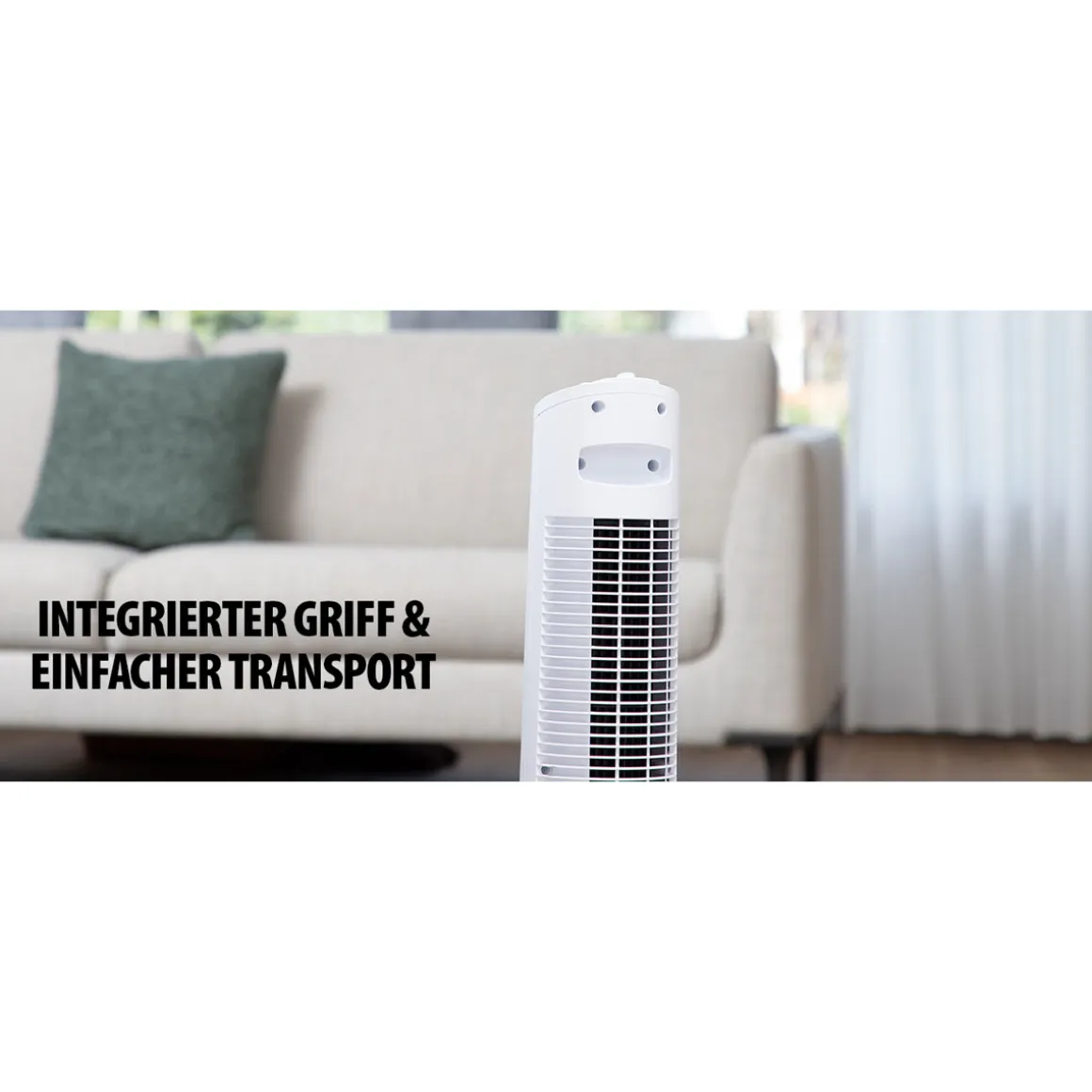 Eleganter und kompakter Turm-Ventilator, in jedem Raum einsetzbar. Mit Oszillationsfunktion zur Kühlung des gesamten Raumes und Timerfunktion für die automatische Abschaltung, also ideal für den Einsatz im Schlafzimmer.