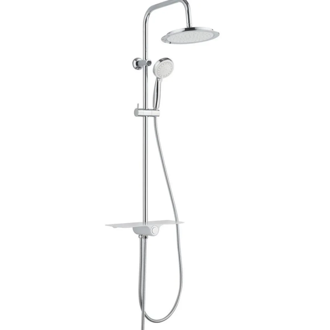 Erleben Sie ein Duscherlebnis der Extraklasse mit dem Überkopfbrauseset Aquastar. Mit seiner eleganten chrom-weißen Optik und praktischen Ablage ist es die perfekte Ergänzung für Ihr Badezimmer.