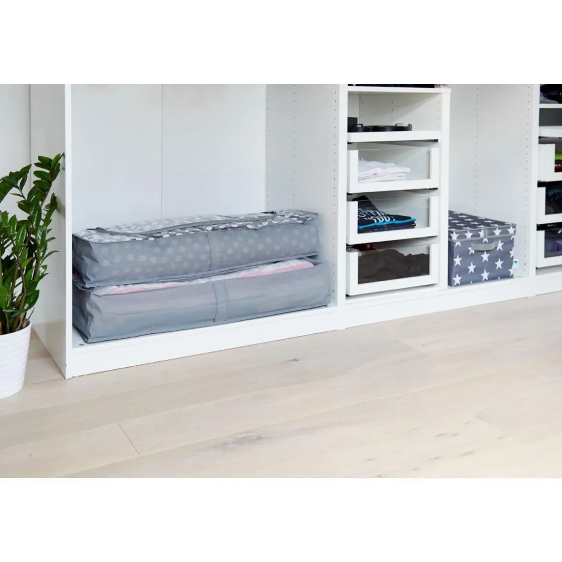 Die Unterbettkommode im 2er-Set bietet Ihnen eine platzsparende Lösung zur Aufbewahrung Ihrer Gegenstände im Wohnzimmer. Durch das Sichtfenster behalten Sie den Überblick über den Inhalt und durch den Reißverschluss bleibt alles sicher verstaut. Das strapazierfähige Polyester sorgt dafür, dass die Kommoden langlebig sind und auch bei häufigem Gebrauch nicht schnell abnutzen werden. Bestellen Sie jetzt Ihre Unterbettkommode im Online-Shop und schaffen Sie mehr Stauraum in Ihrem Zuhause!
