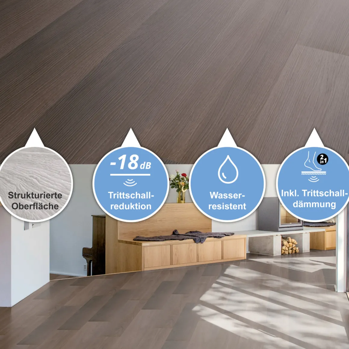- Integrierter Trittschall reduziert Geräusche effektiv und sorgt für mehr Wohnkomfort.