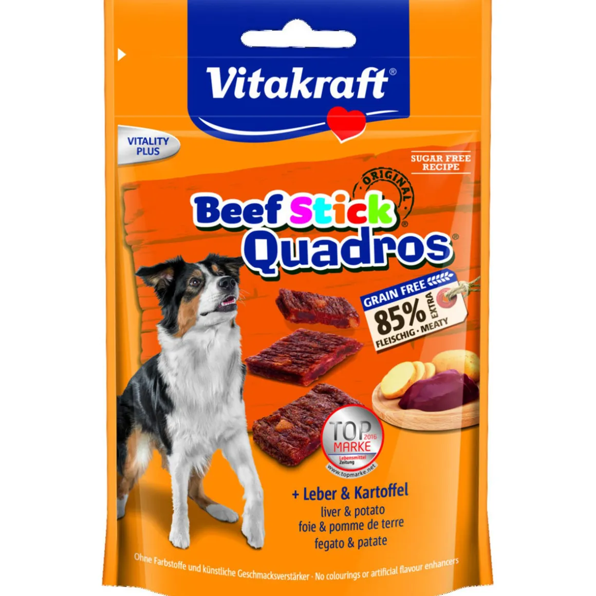 Die fleischigen Beef Stick Quadros werden mit extra viel Liebe nach bewährter original Beef Stick Rezeptur hergestellt. Zudem enthalten die köstlichen kleinen Rauten ein raffiniertes Extra: verführerische Stückchen von Leber und Kartoffel, die dank des schonenden Herstellungsverfahrens sogar auf den ersten Blick erkennbar sind. Eine absolute Delikatesse für Ihren Hund!