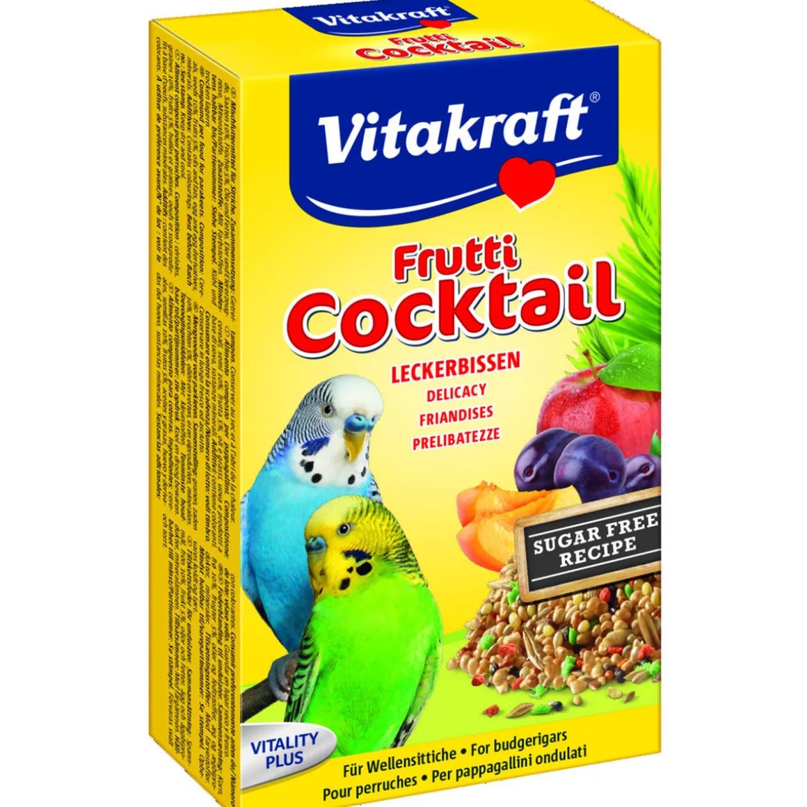 Knusperspaß zum Verwöhnen: Mit köstlichen Früchten sorgt Frutti Cocktail für Abwechslung auf dem Speiseplan Ihrer Wellensittiche! Der Knabber-Mix ist nicht nur besonders schmackhaft, er enthält auch wertvolle Vitamine – und sonnengereifte Saaten machen den Leckerbissen darüber hinaus zu einem gesunden Energiespender. Eine Mischung, die’s in sich hat!