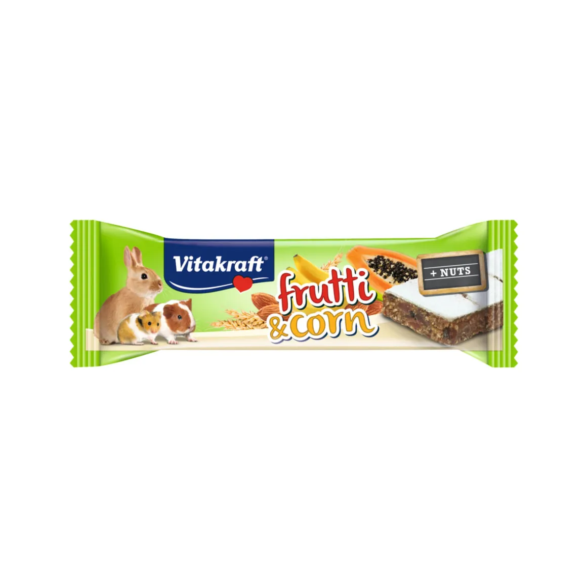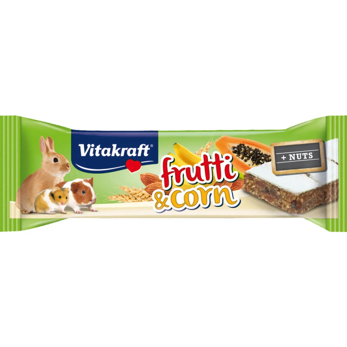 Frutti & Corn enthält neben leckerer Banane, süßen Feigen und köstlicher Papaya zum Beispiel auch schmackhafte Mandeln – Sie werden sehen, Ihre Nager werden begeistert sein! Besonders praktisch: Der extra fruchtige Snack ist dank der Bruchrillen einfach zu portionieren.