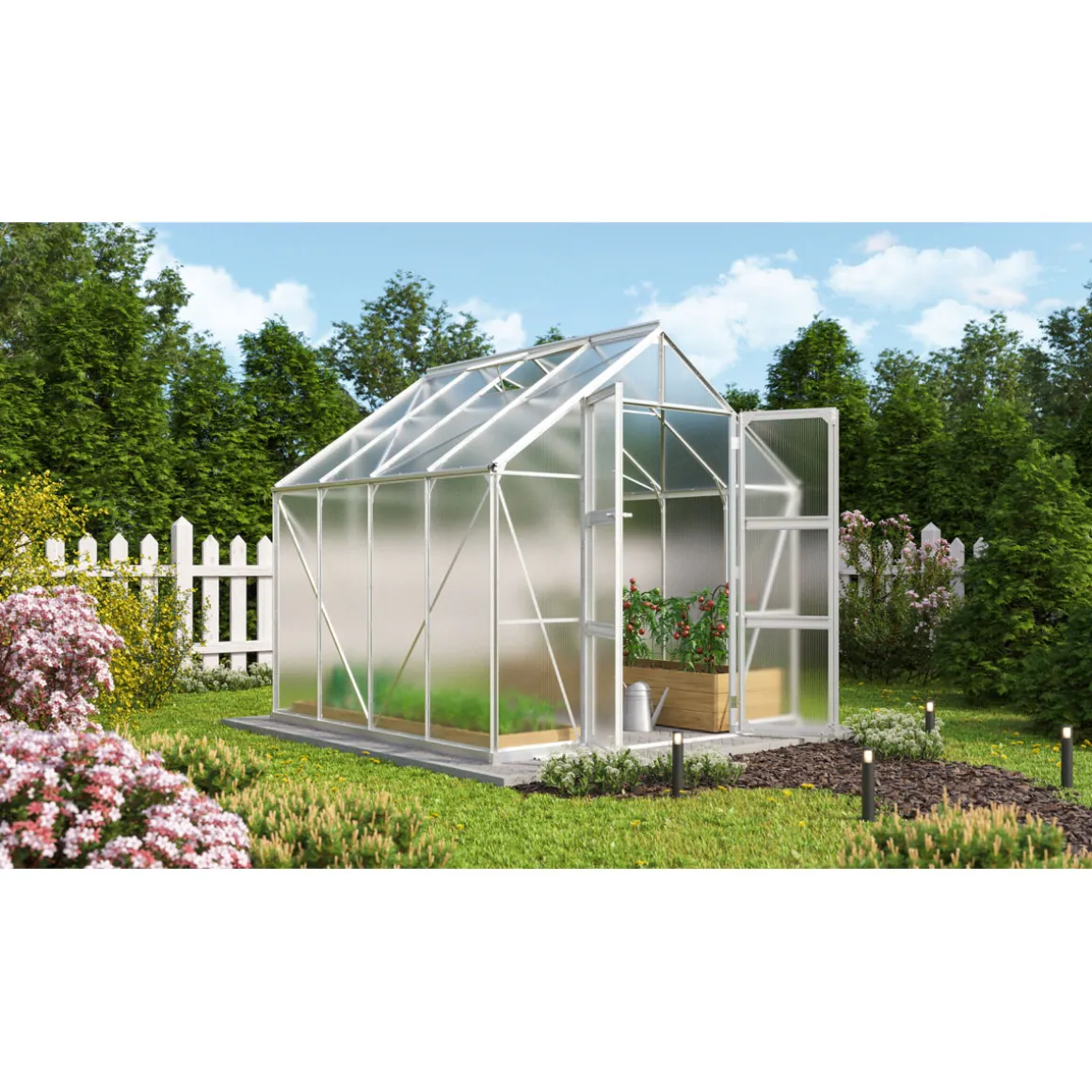 Das Vitavia Gewächshaus Domus ist ein geräumiges Freistehgewächshaus aus hochwertigem Aluminium mit einer Grundfläche von ca. 6,7 m². Es bietet genug Platz für all Ihre Pflanzen und schützt diese zuverlässig vor Wind und Wetter. Die stabile Befestigung der Hohlkammerplatten im Rahmen sorgt dafür dass das Haus lange hält.Das klassische Satteldach gibt dem Ganzen eine ansprechende Optik.Dank des abschließbaren Stahlschlosses mit Aluminium-Türgriff sind Ihre Pflanzen sicher aufbewahrt.Das Set enthält alles was man braucht um das Haus aufzubauen.Es eignet sich perfekt für Hobbygärtnerinnen/-gärtner sowie Gartenliebhaber/-liebhaber unter unseren Kunden von .